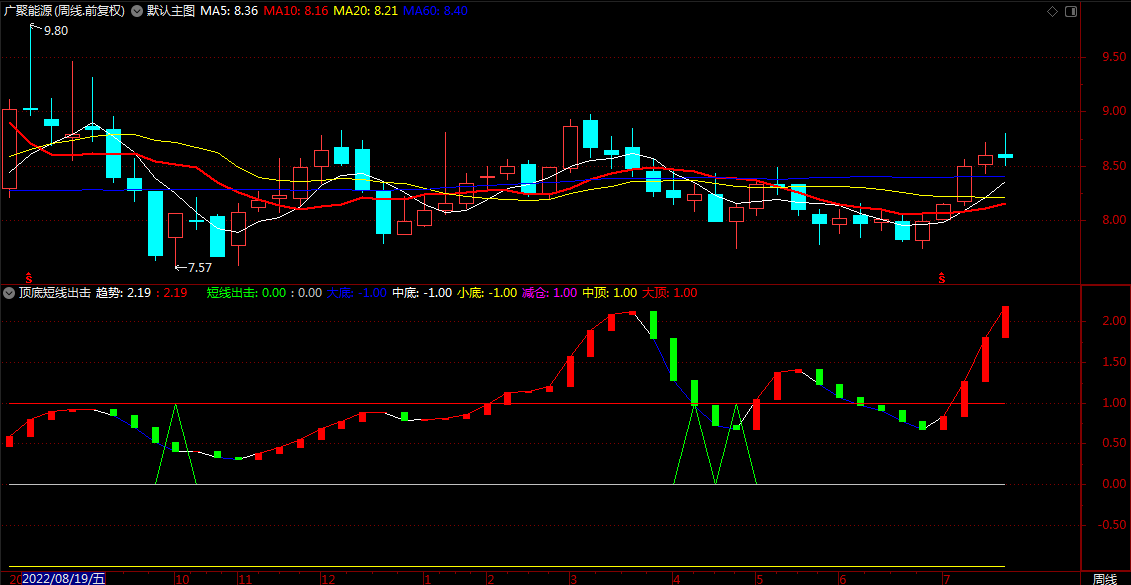短线出击:IF(CROSS(X_8,1) AND X_8<30,1,0);