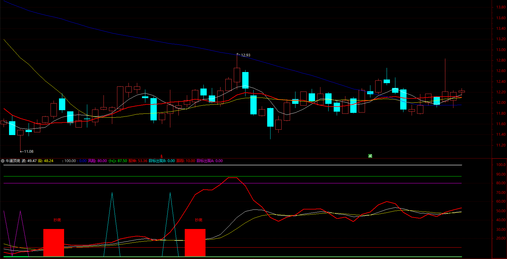红柱“抄底”提示,蓝色三角形目标出现,建仓