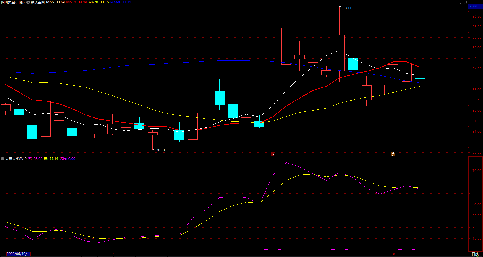选股:CROSS(紫,黄) AND CLOSE>MA(CLOSE,60);