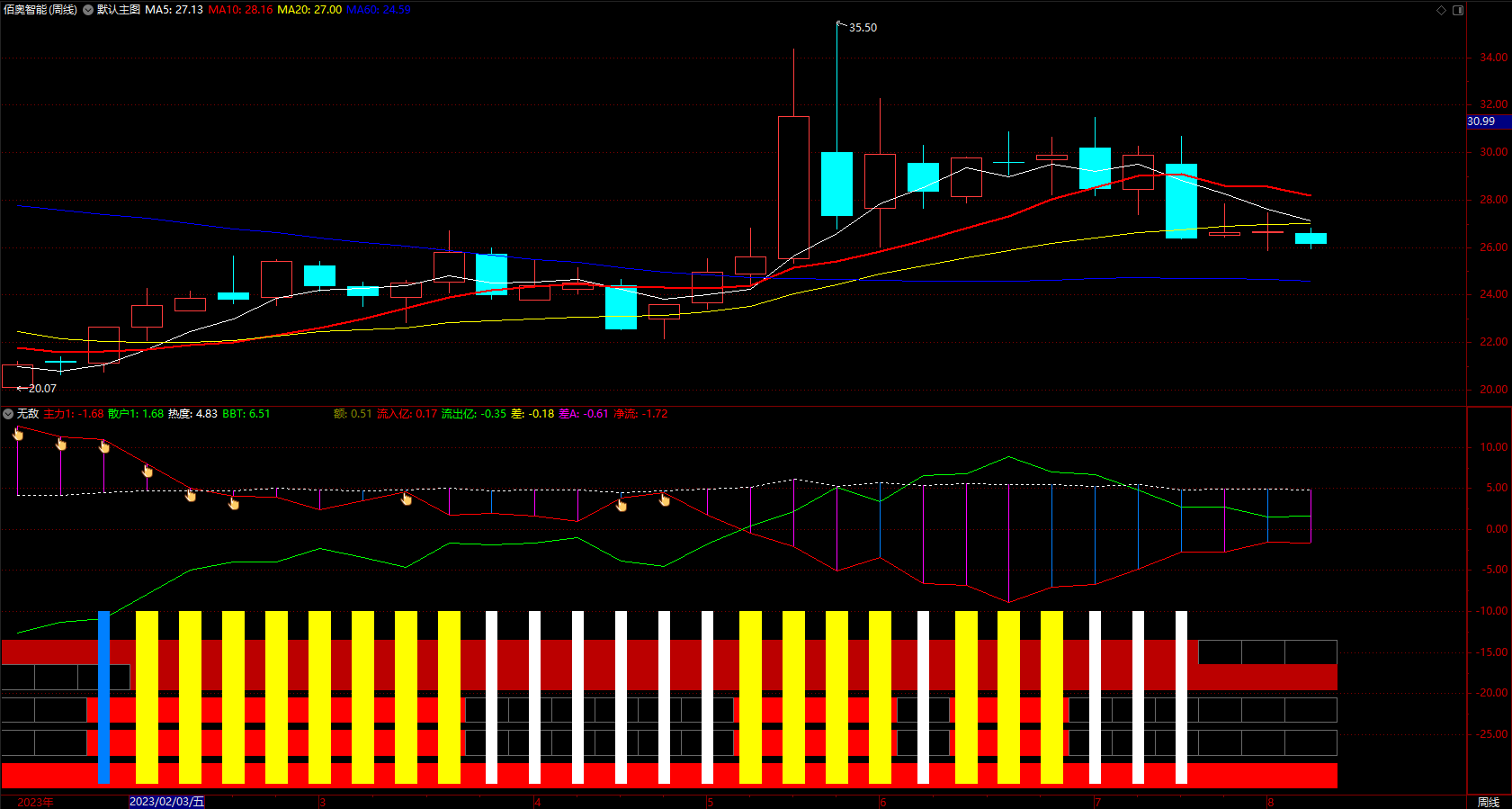 弱势:STICKLINE(VUR6<0,0,VUR6,3.3,0),COLOR005AAA;
