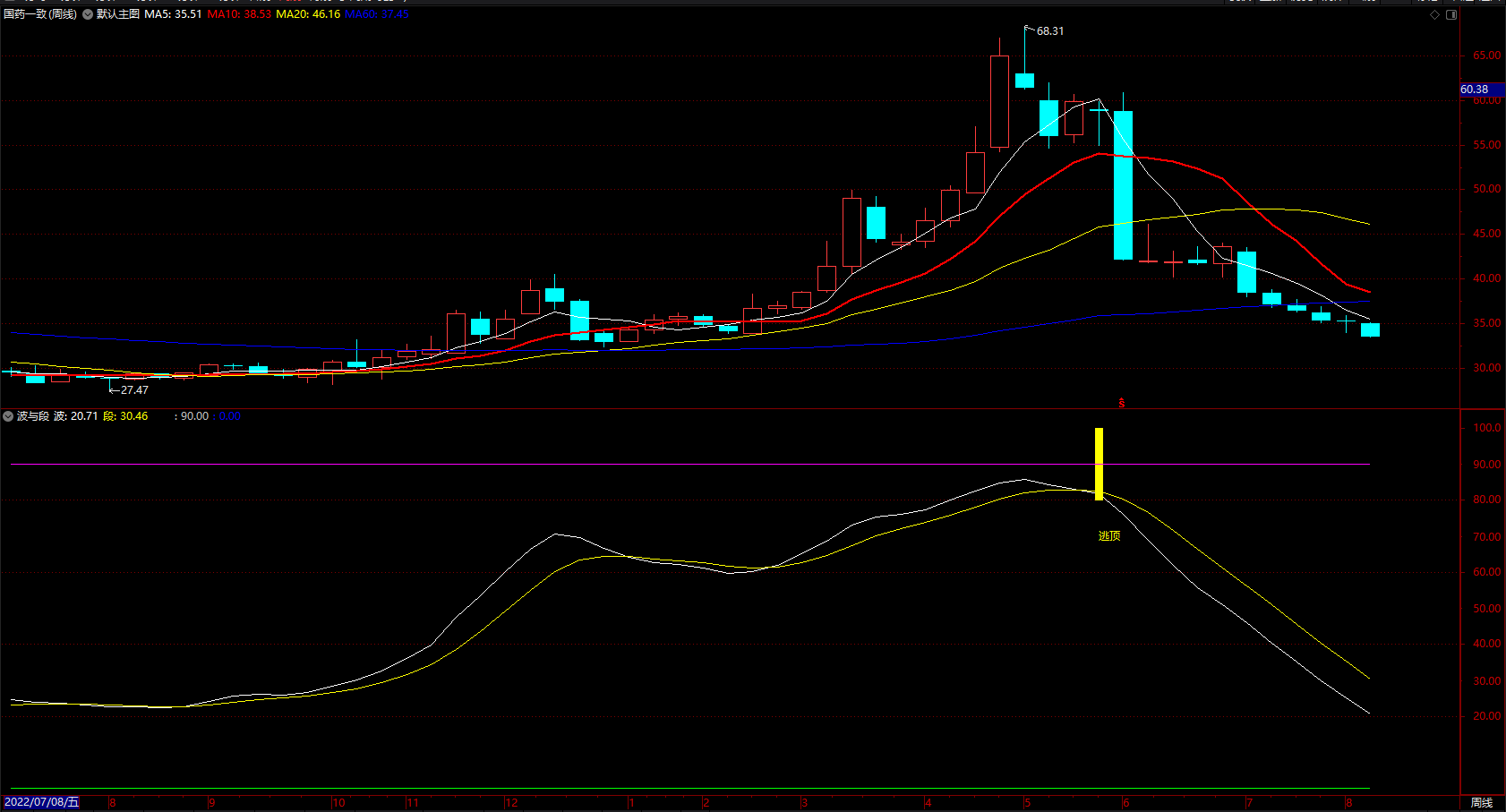 卖点:当白线下破黄线时是卖出信号,如出现“逃顶”字样则可信度更高。