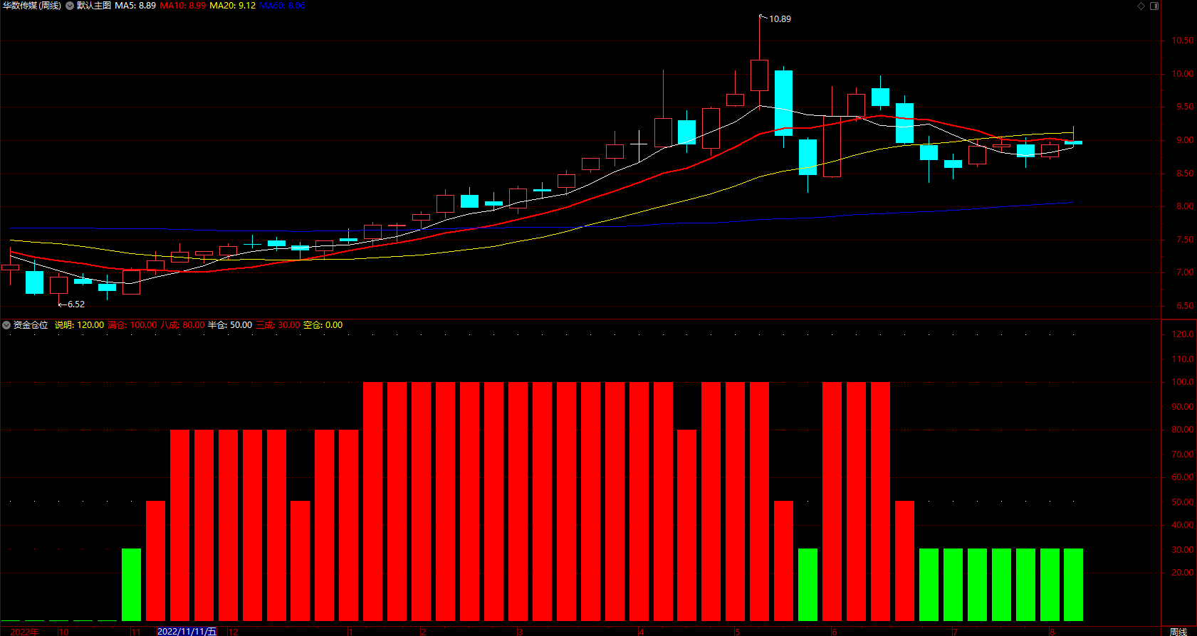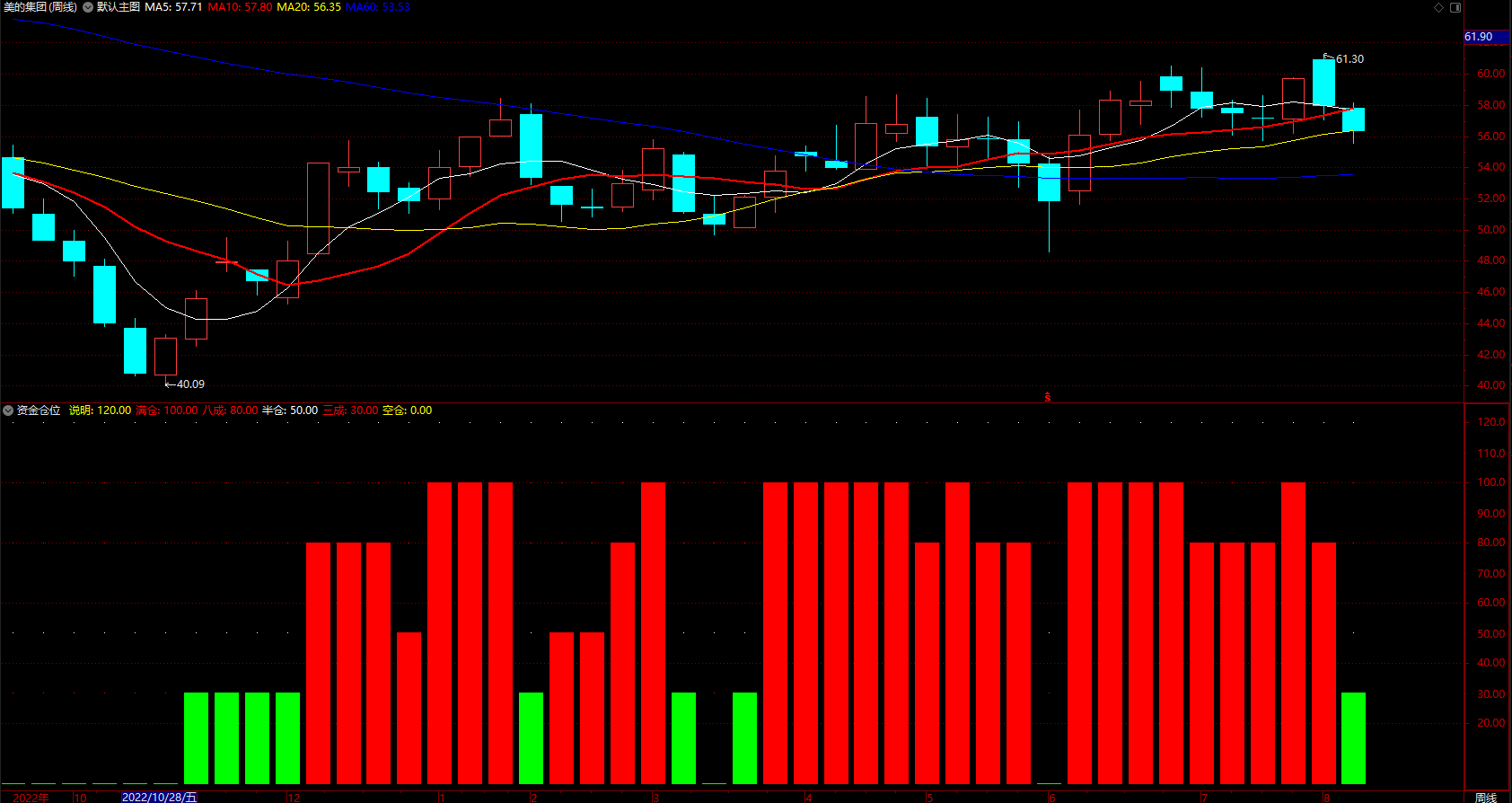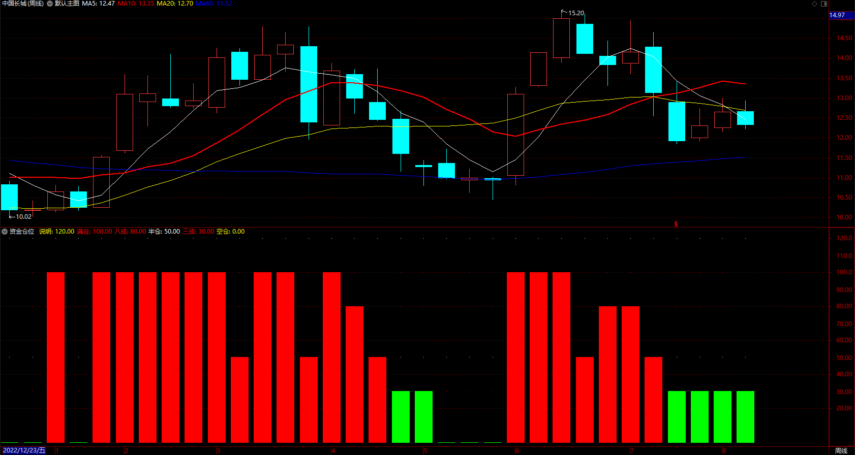 仓位指标设有满仓线、八成线、半仓线、三仓线,红色持仓,绿色和没有颜色区域坚决空仓