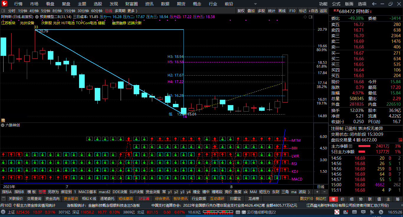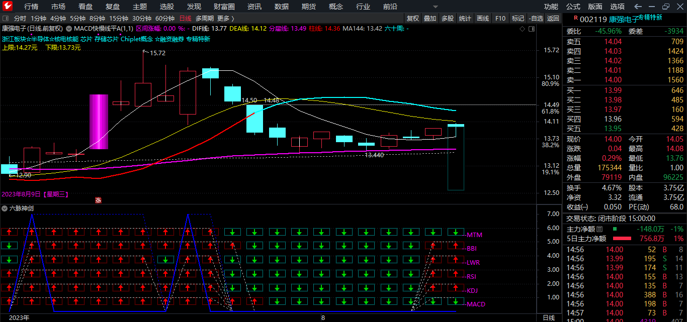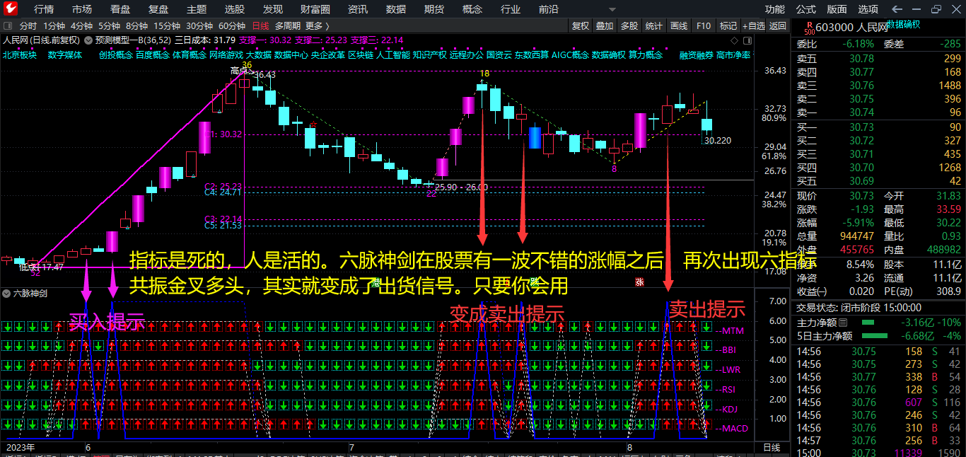 通达信六脉神剑指标是指: MACD金叉+KDJ金叉+RSI金叉+LWR金叉+BBI金叉+MTM金叉,共振金叉多头状态下用红箭头,否则用绿箭头在附图表达状态。最近在很火。不过抖音上都是网上捡来的修改小了参数版的指标。我提供两个版本六脉神剑附图和选股:一个版本是六个指标和系统的六个指标参数一模一样的,另外一个版本是和系统的六个指标比较参数修改小了的。选股指标随附图也是两个版本。