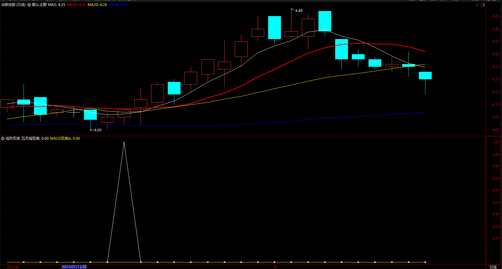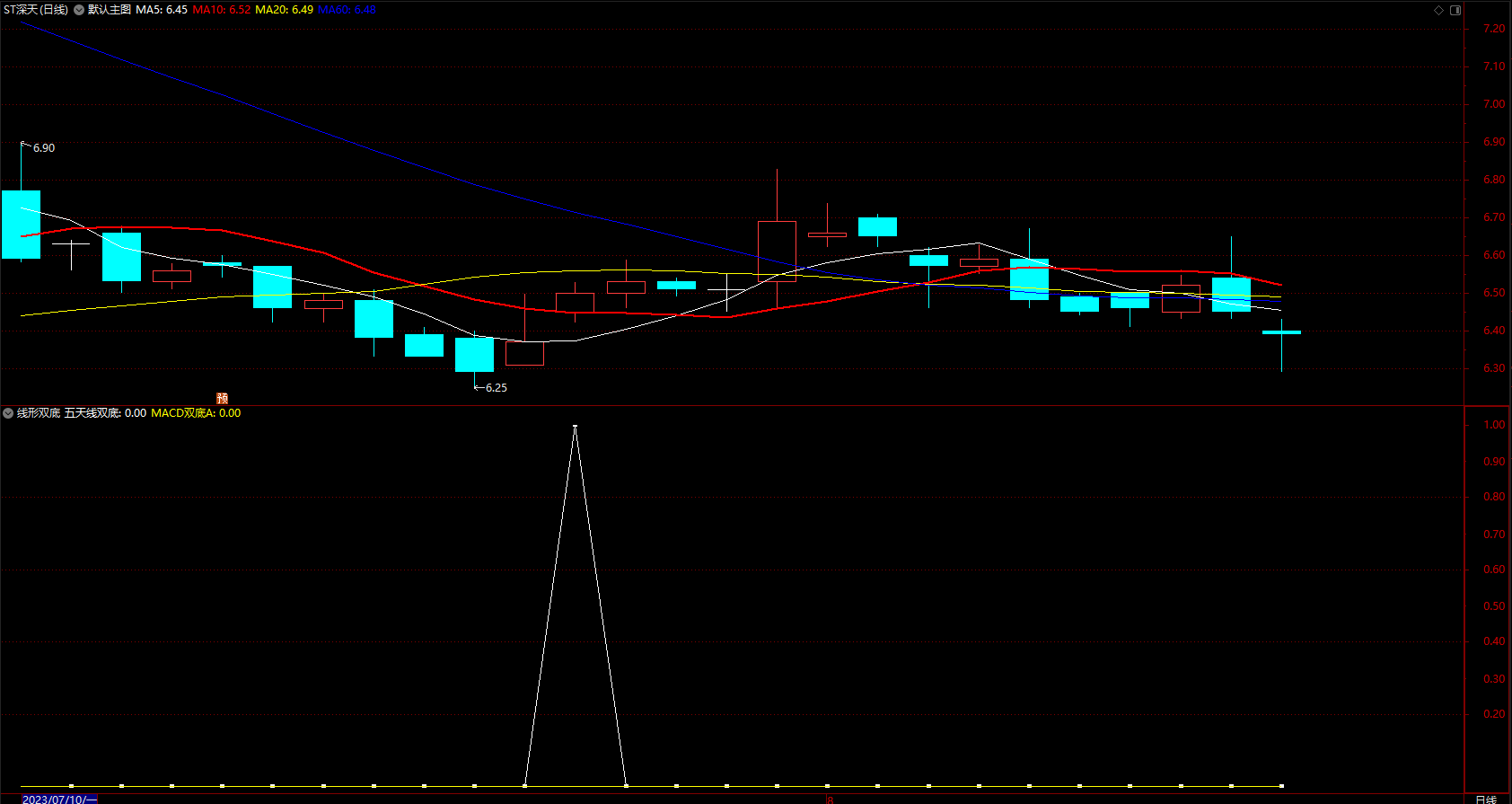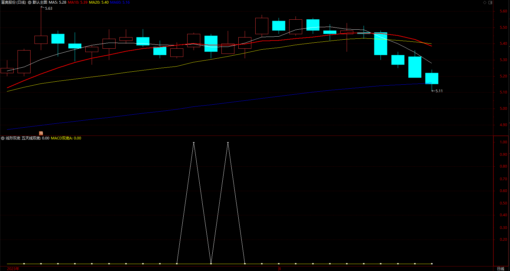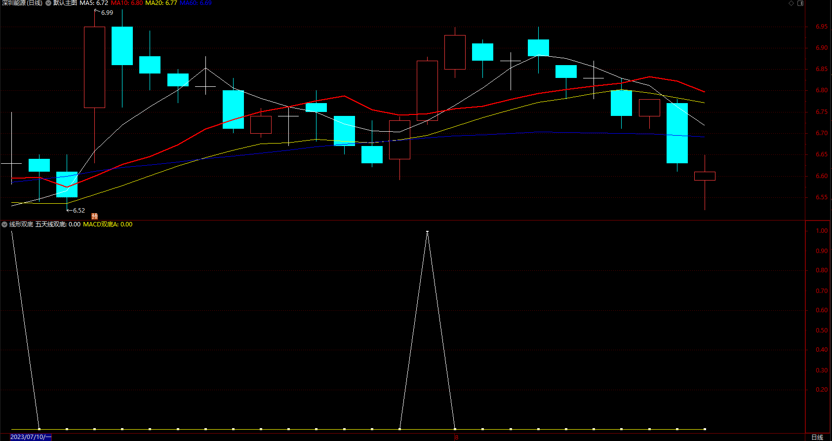五天线双底:IF(JCSJ1=1 AND MA5>REF(MA5,JCSJ2) AND COUNT(趋势<0,4)>=2,1,0);