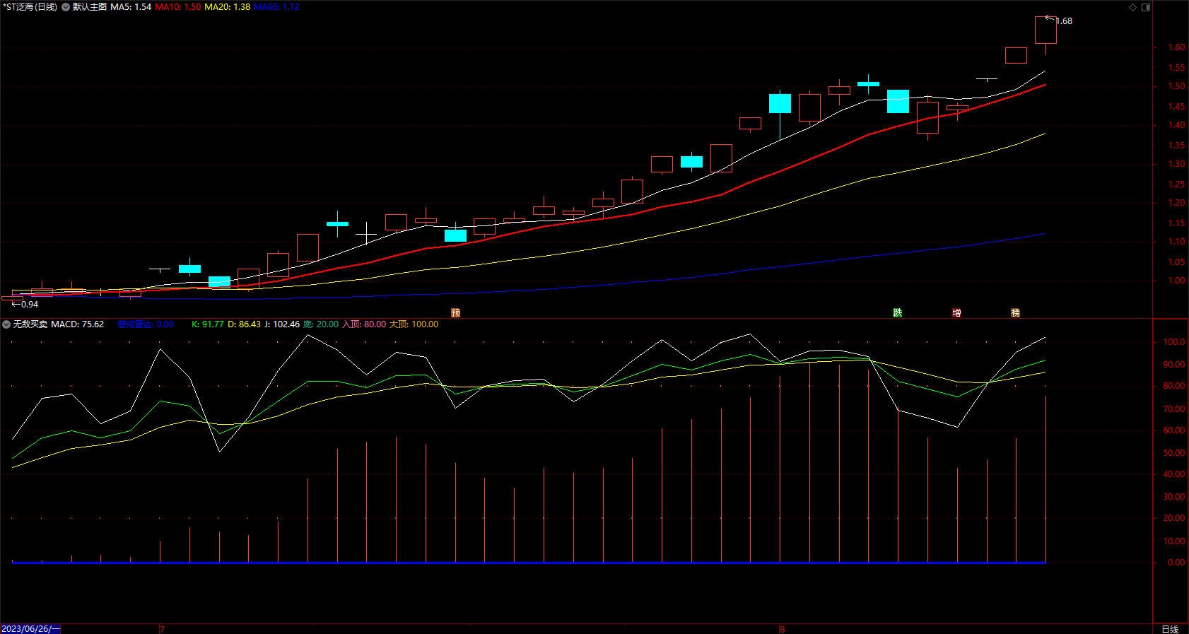 本指标将KDJ和MACD进行优化结合,K线形态结合MACD红柱变化,能精准把握趋势。