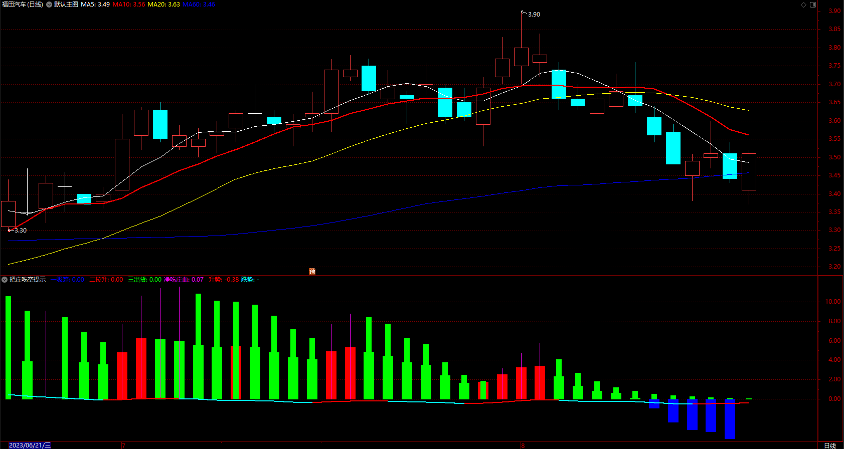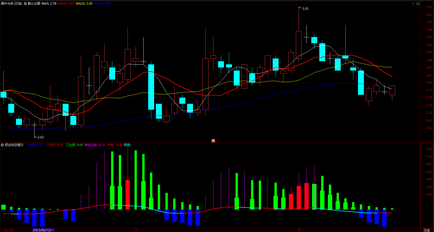 股价回调的时候,“把庄吃空”指标显示绿色柱,这时多意为洗盘(洗盘很多时候也带有一定量的出货,从而把价格打压下来)。