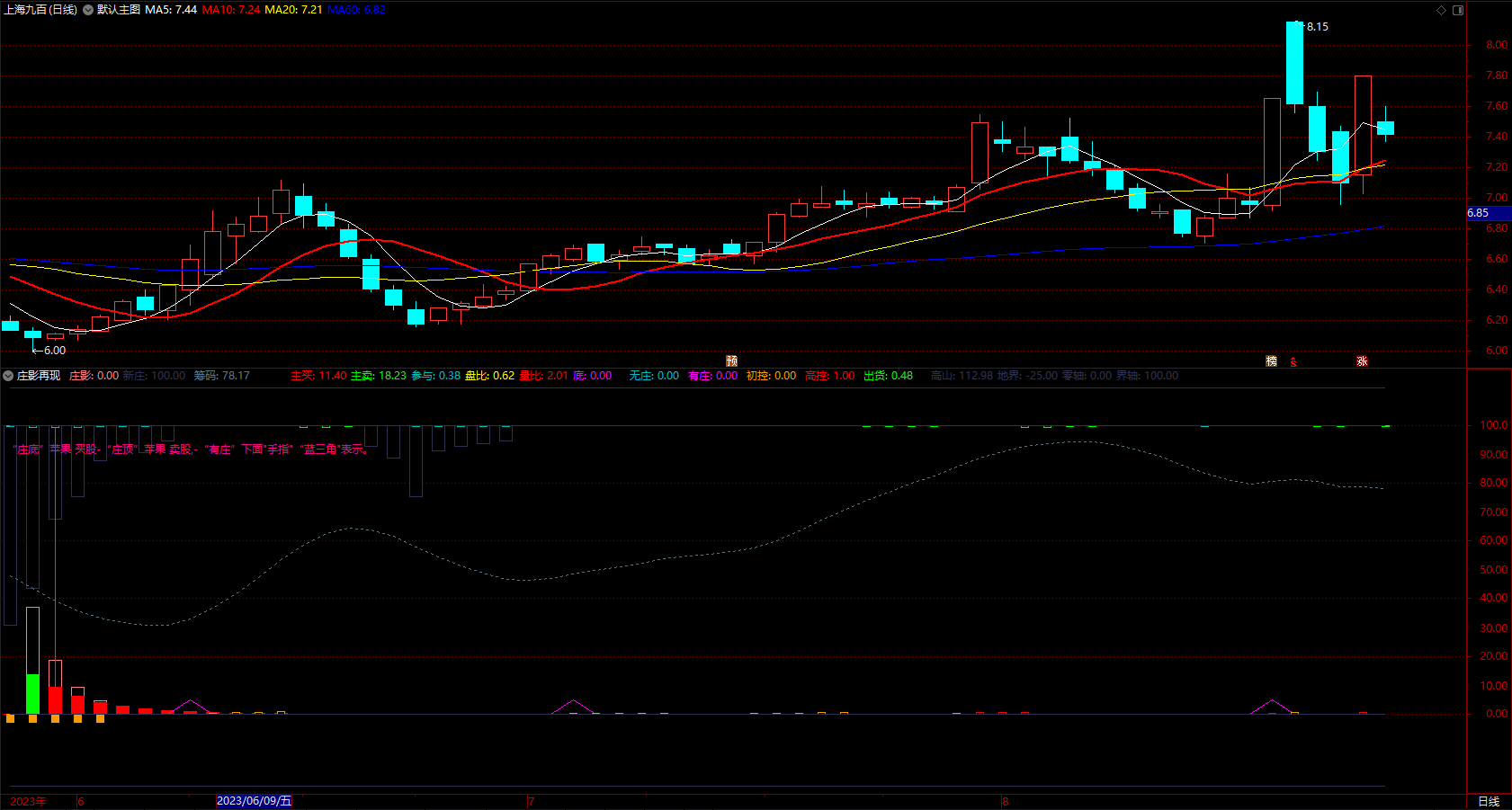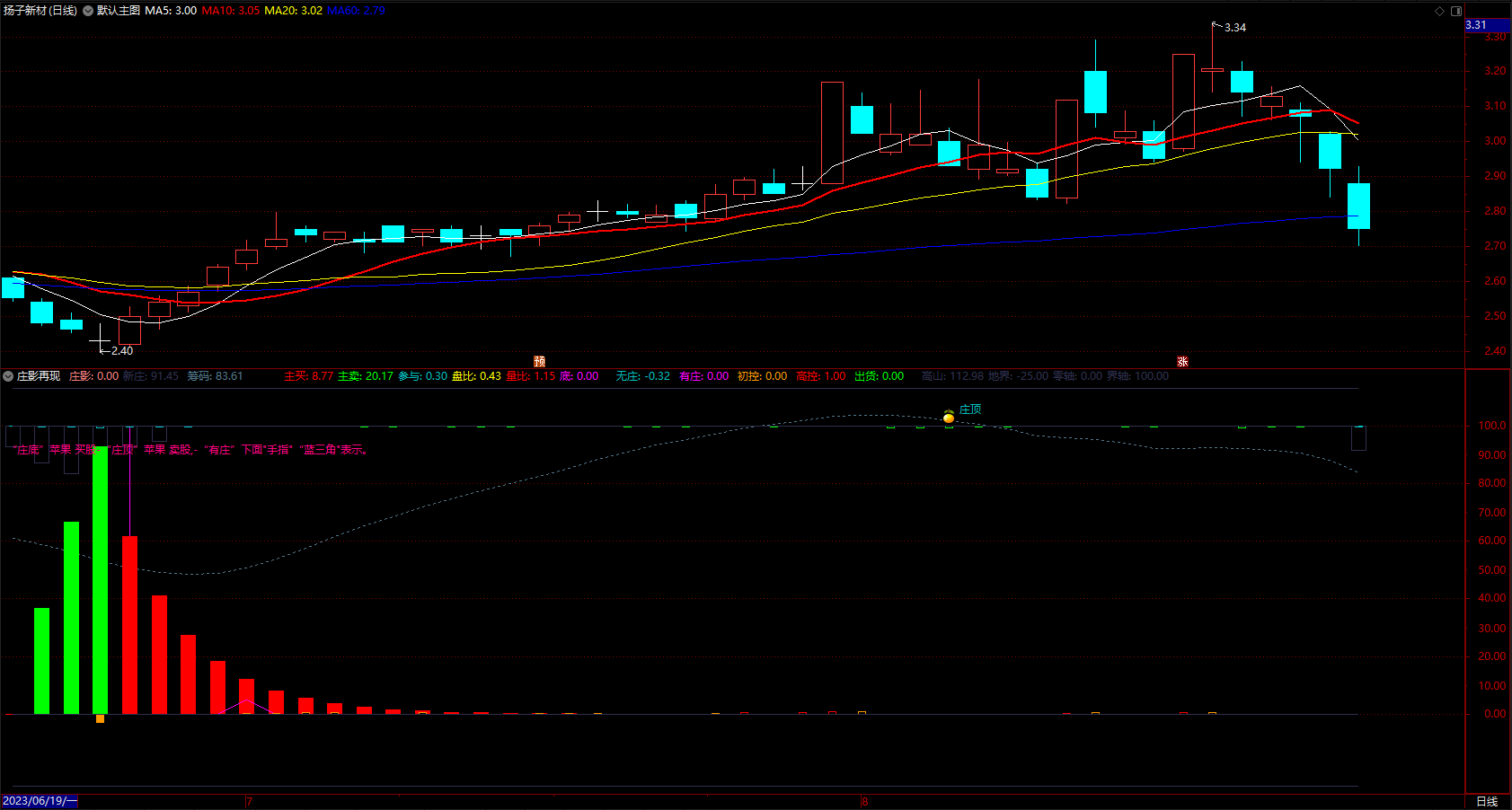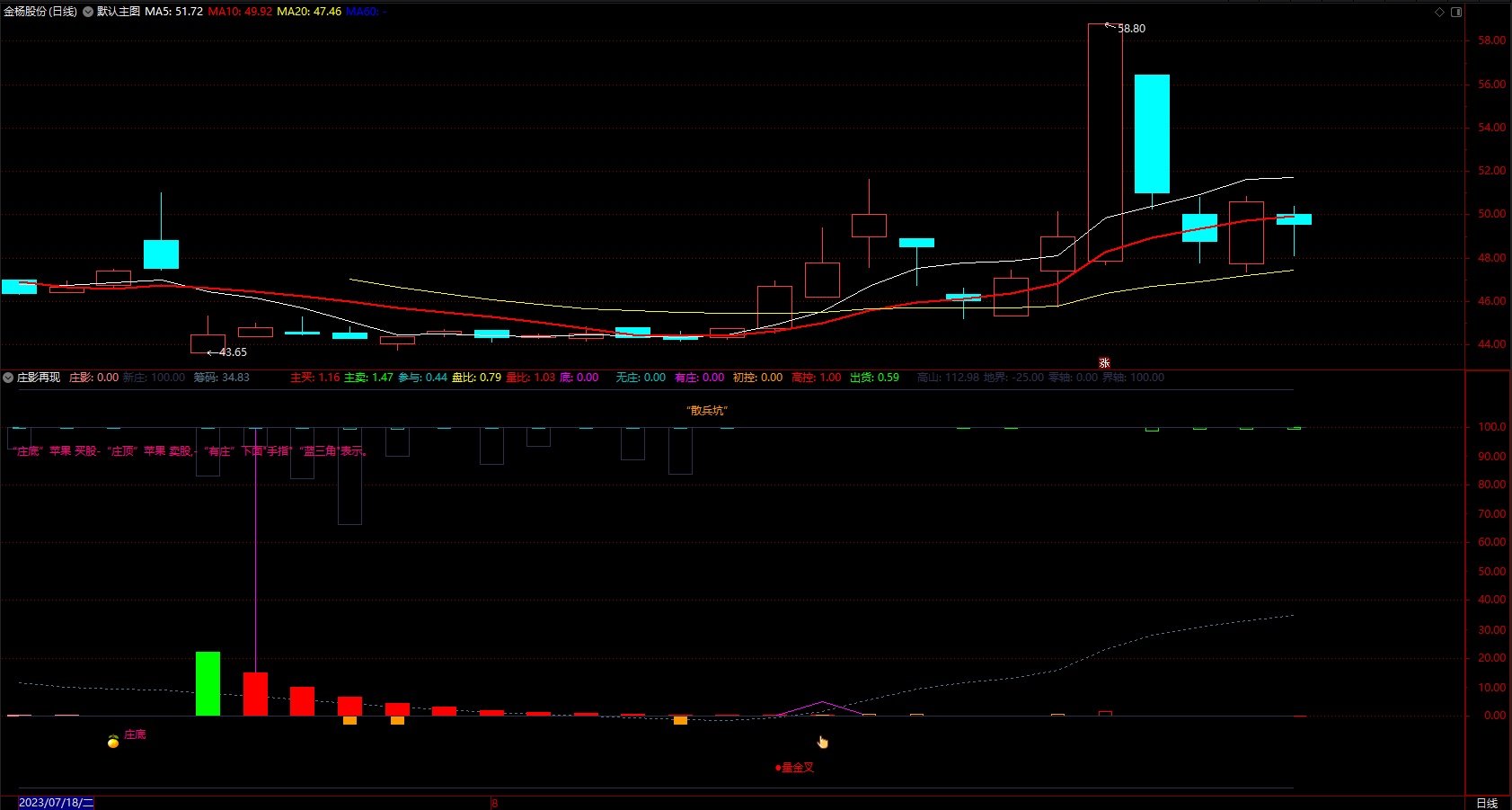 “庄底”苹果 买股-“庄顶”苹果 卖股,-“有庄”下面"手指"“蓝三角"表示。