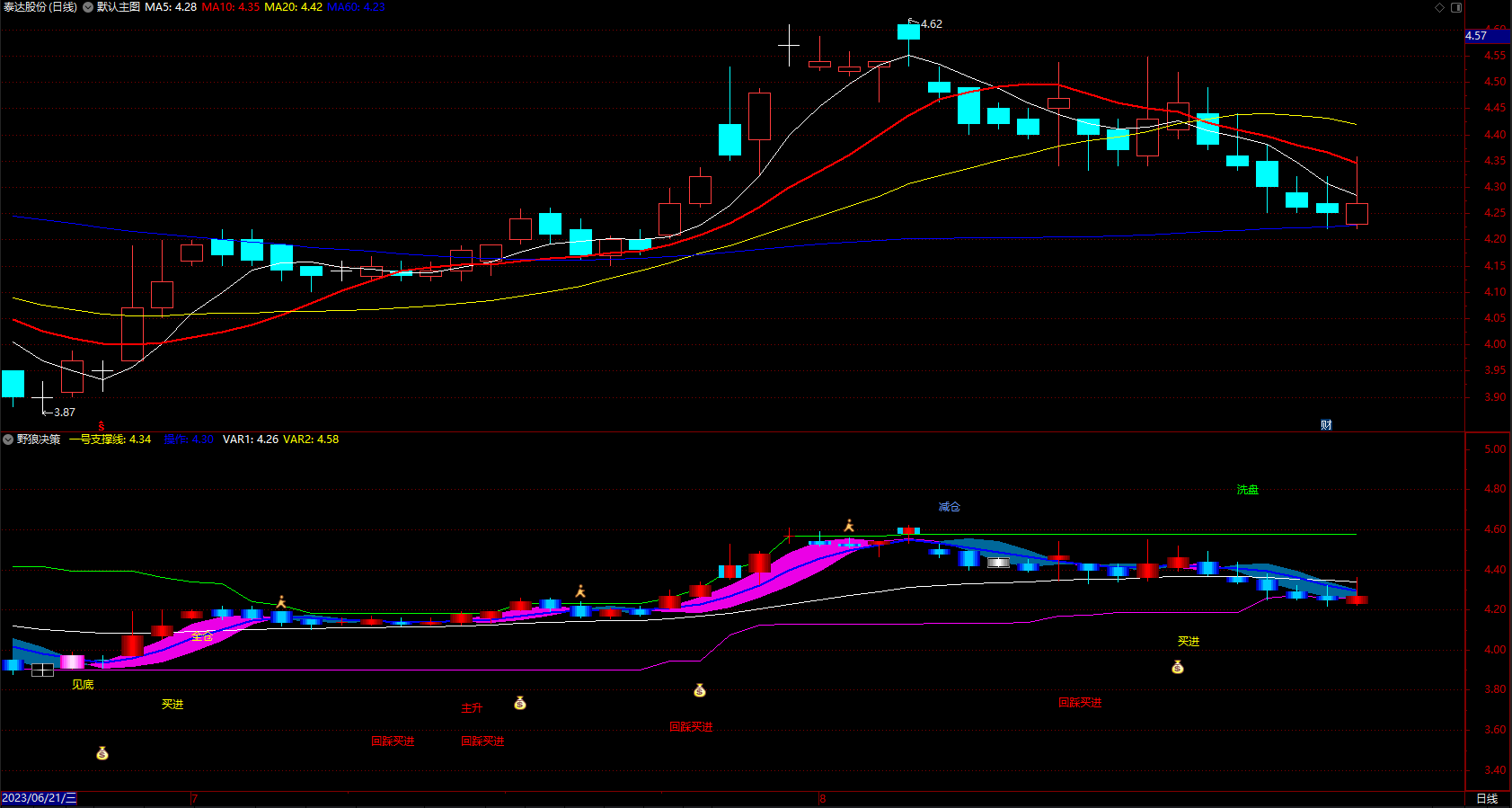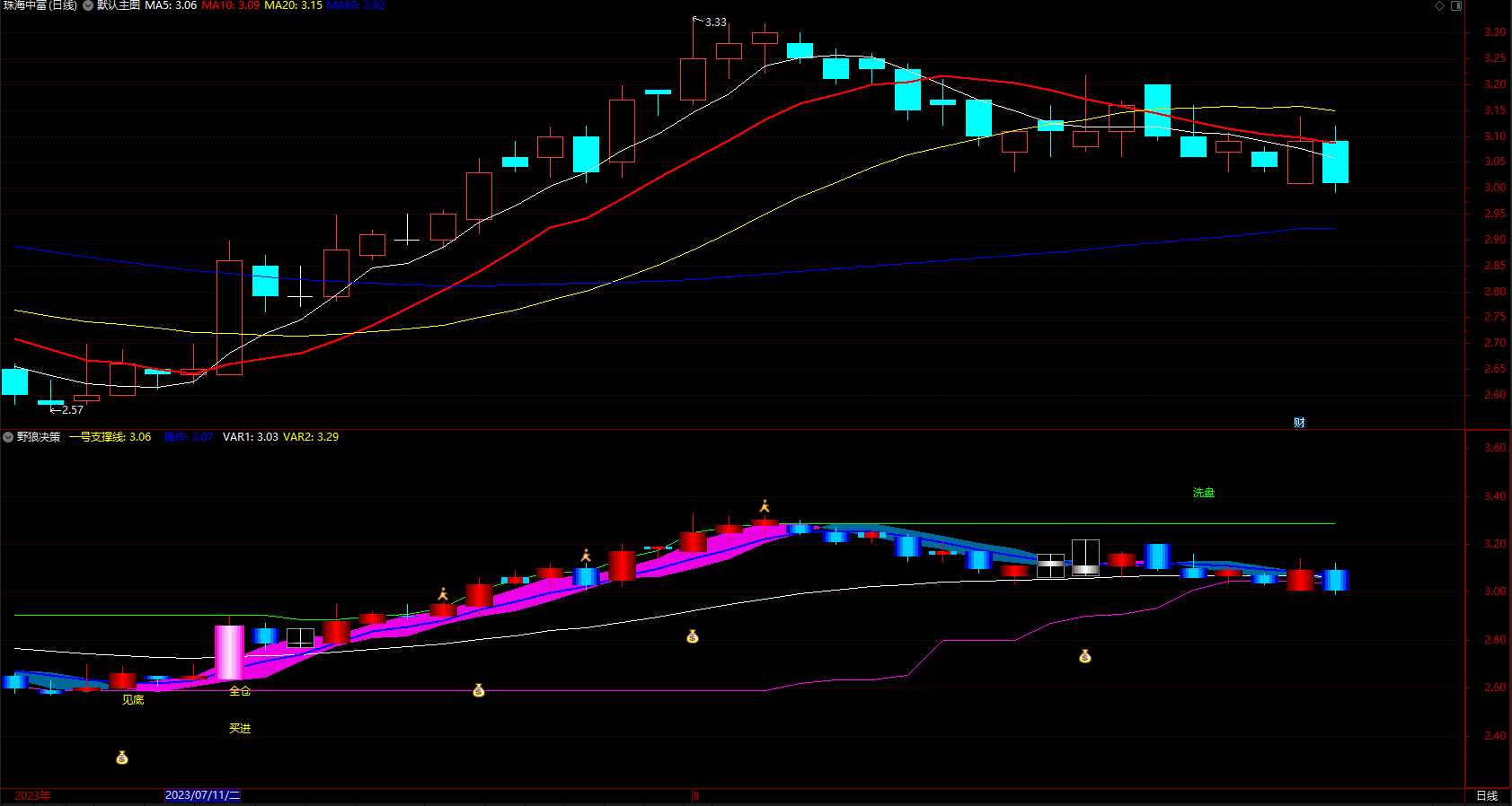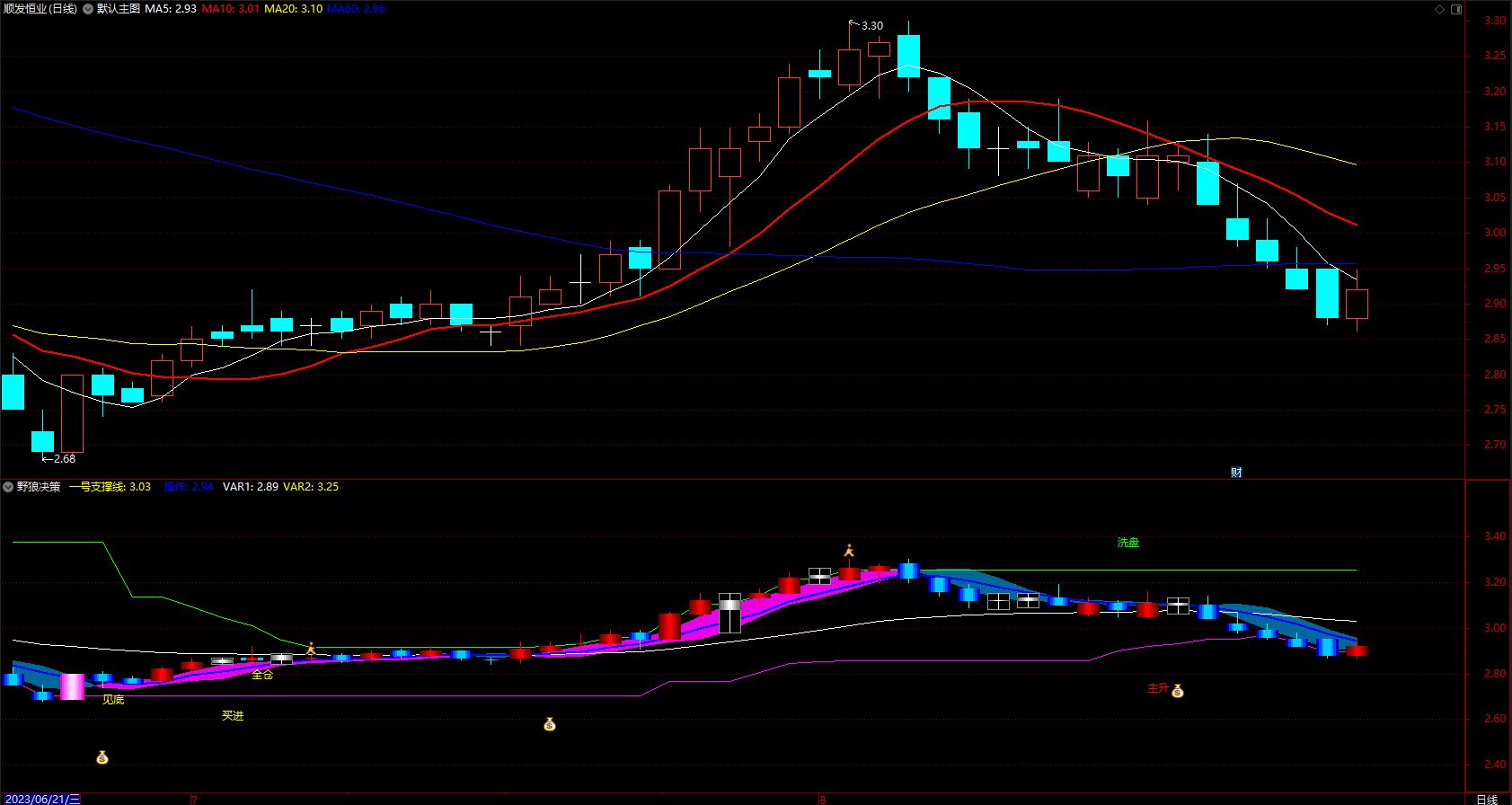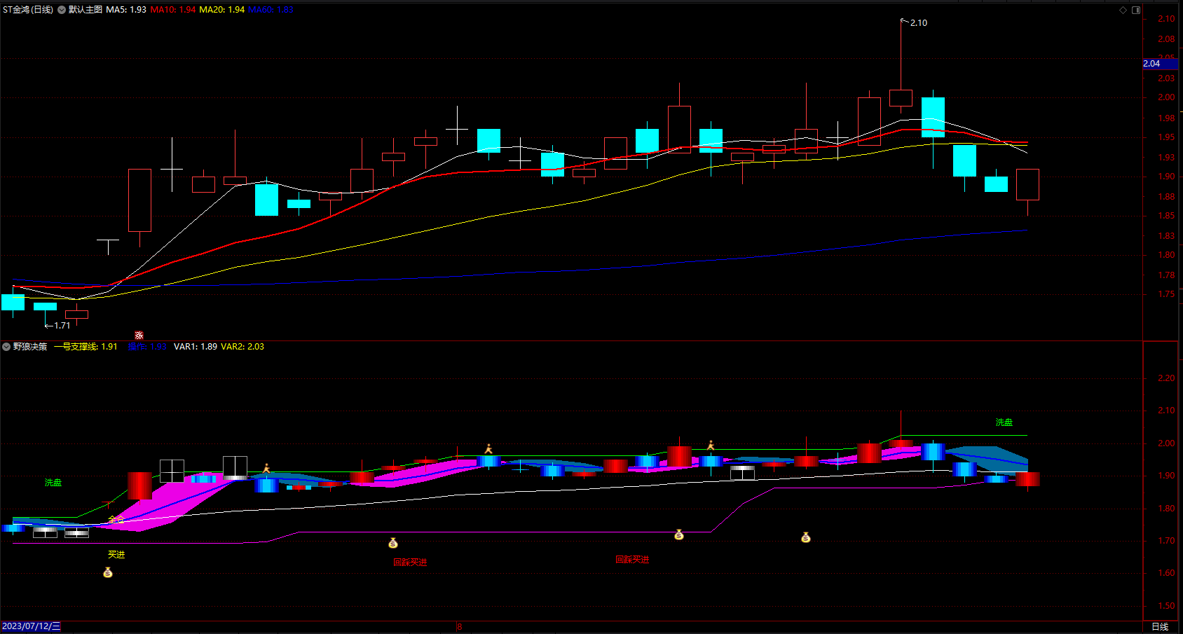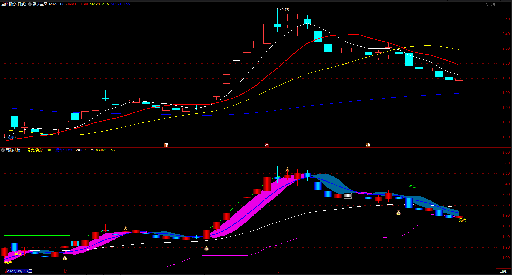 DRAWTEXT(CROSS(一号支撑线1,上线1),H*1.08,'洗盘'),COLOR00FF00;