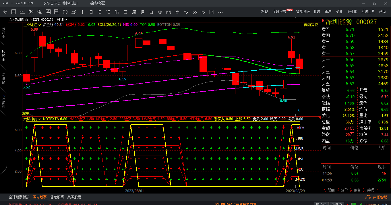 文华财经版六脉神剑指标是指: MACD金叉+KDJ金叉+RSI金叉+LWR金叉+BBI金叉+MTM金叉,共振多头状态下用红箭头,否则用绿箭头在附图表达状态。六脉神剑指标还有他特殊的用途,比如在个股大幅拉伸后,涨幅超过百分百,这时候再次出现六脉神剑共振金叉就要注意兑现利润。这是背离多头。而且非常准。