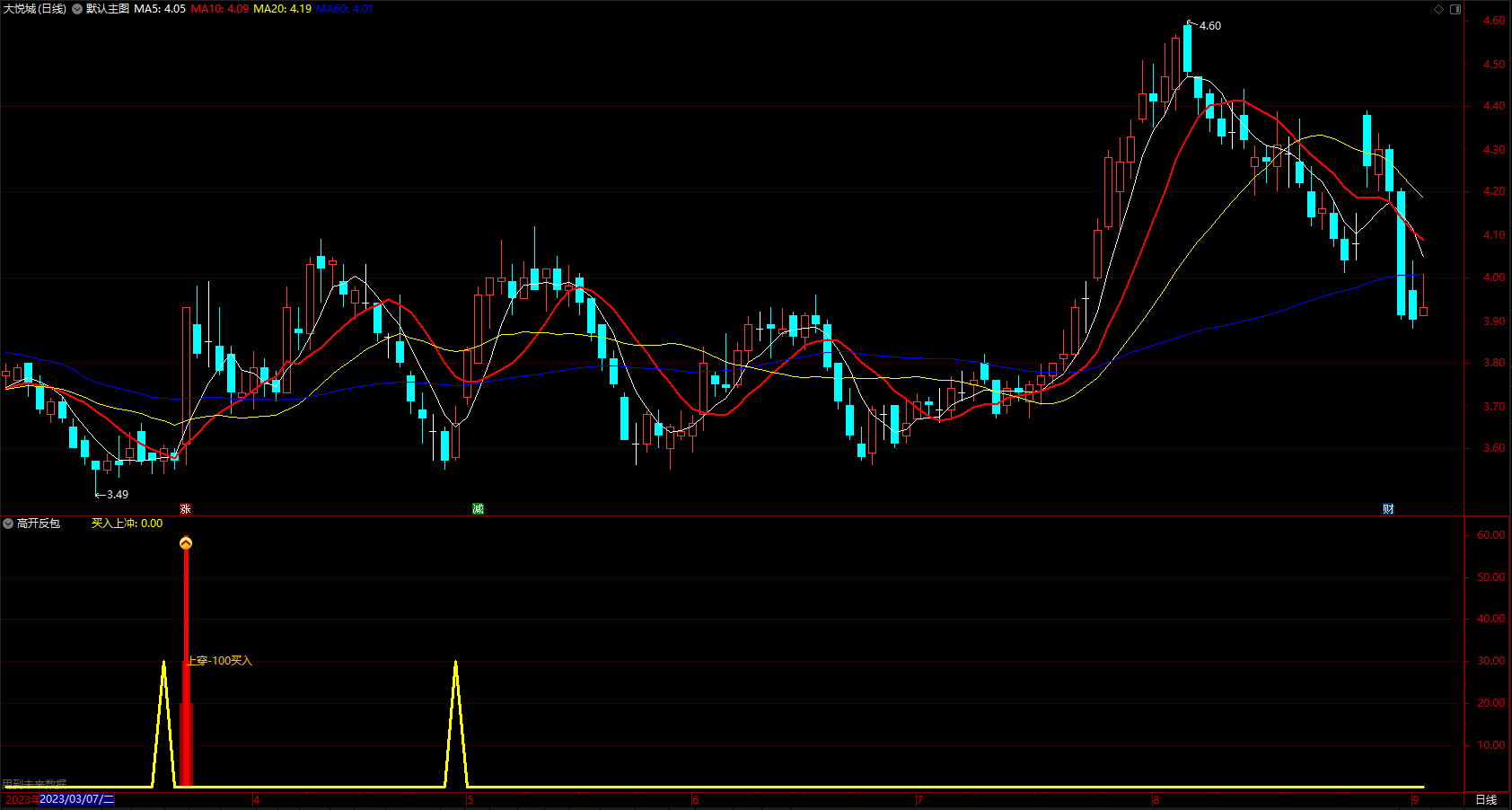 买入上冲:IF(X_3 AND COUNT(X_3,3)=1,30,0),COLORYELLOW,LINETHICK3;