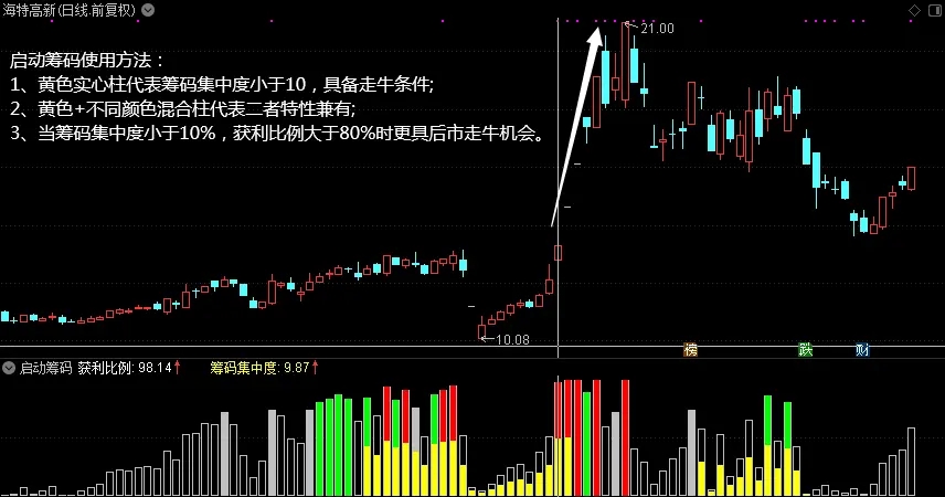 重点提醒一下:此指标最大的作用是帮助大家选出那些未来有机会走牛的潜力股,选出来后建立专门的股票池重点观察,真正的牛股妖股大部分都要具备筹码集中度小于10%而且筹码获利比例又达到80%这两个条件,谁有向上突破异动就很容易观察出来。该指标不是指示具体买点的指标,但可作为买入决策的辅助参考指标。