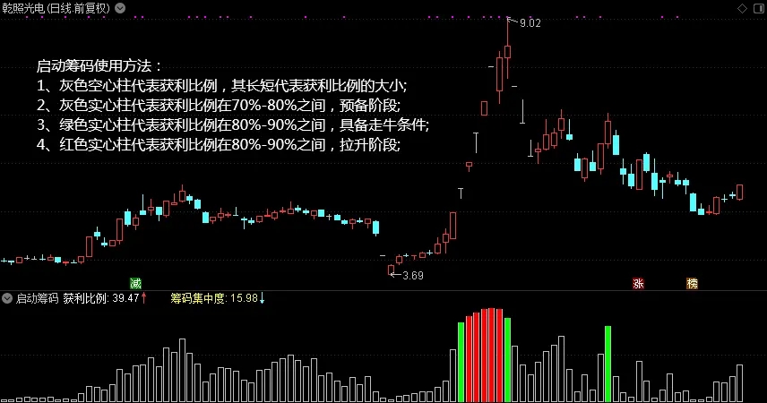 启动筹码指标简介:画面非常简约,就抓住关键的两点,筹码集中度和筹码获利比例,观察数值,并形象的用不同的颜色标注出来便于我们一目了然(具体介绍请看截图),手机上的通达信软件装上看筹码更加方便。并配套有专门的选股公式选牛股(选筹码集中度小于10%而且筹码获利比例又达到80%以上二者兼备的股),节约大家的时间。