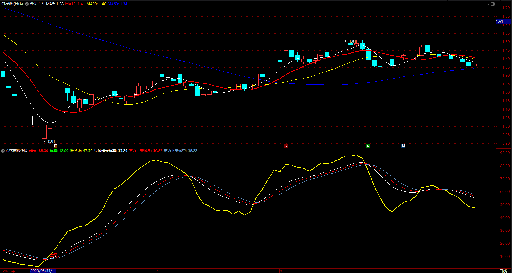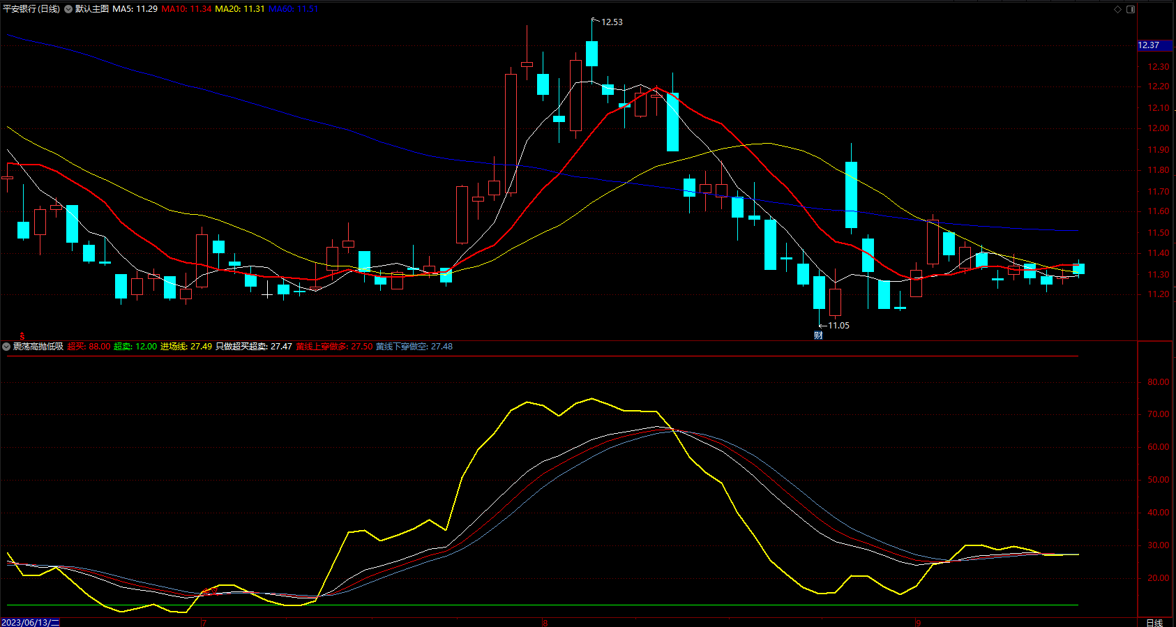黄色线为进场线,只在超买88以上和超卖12以下进场把握高。