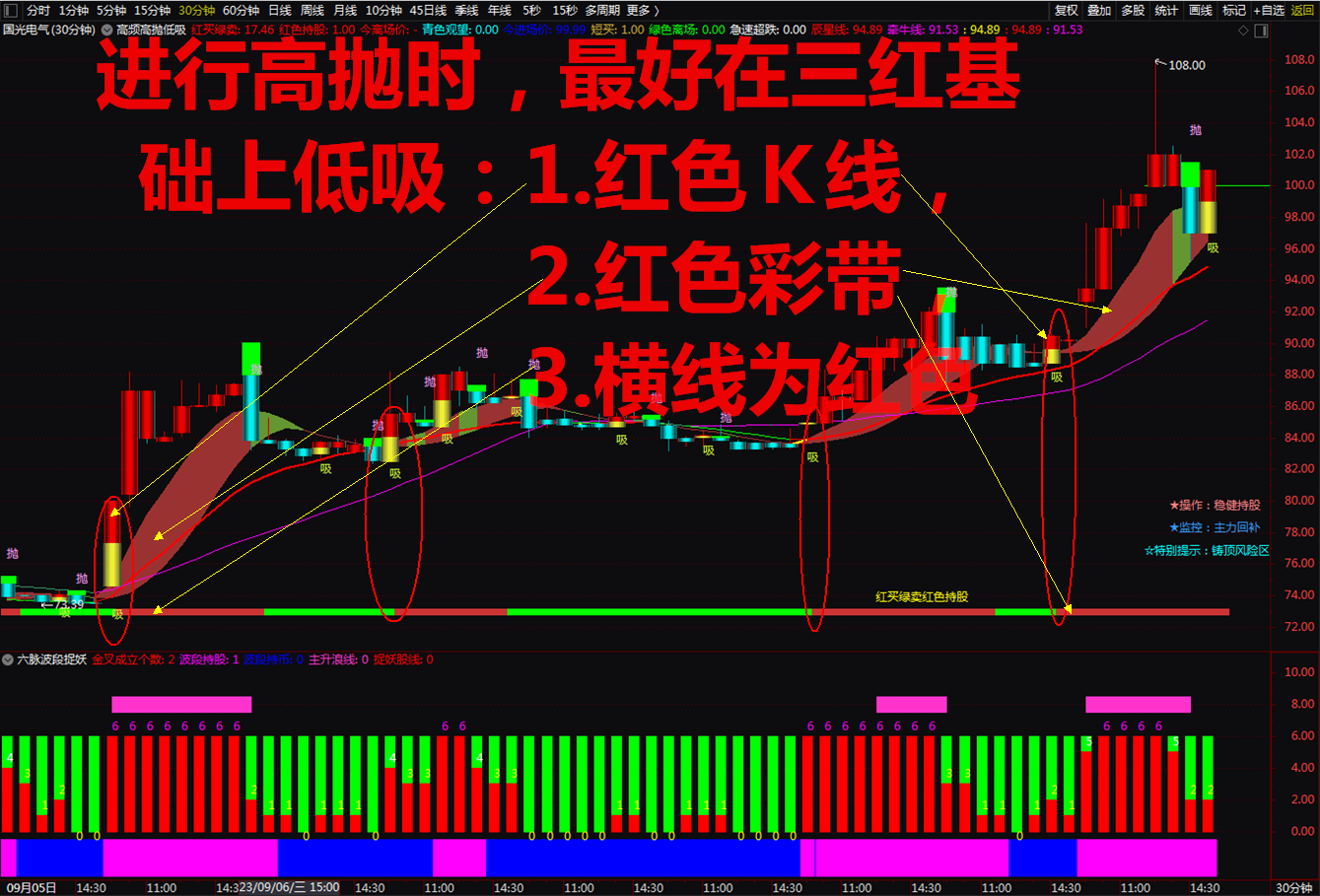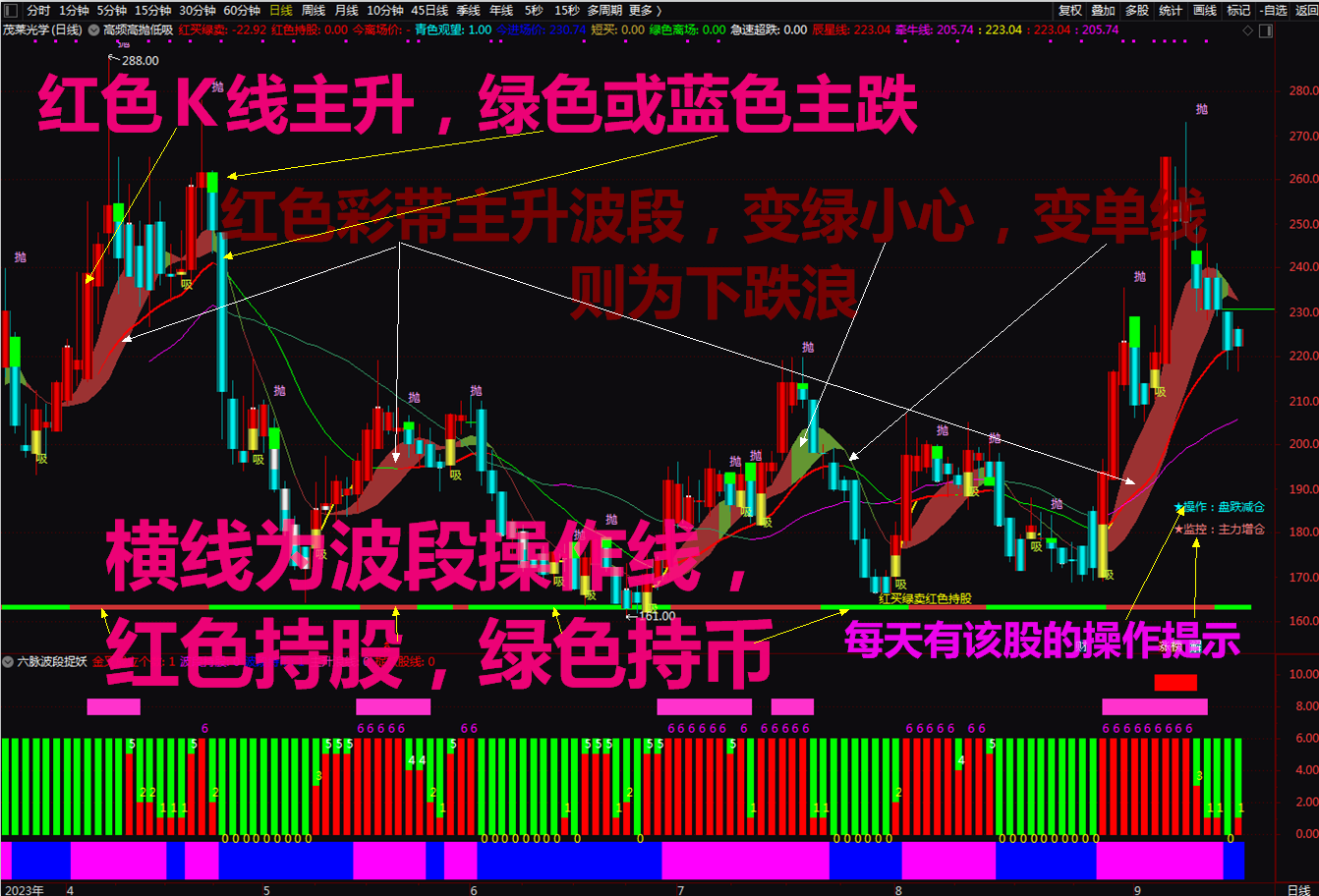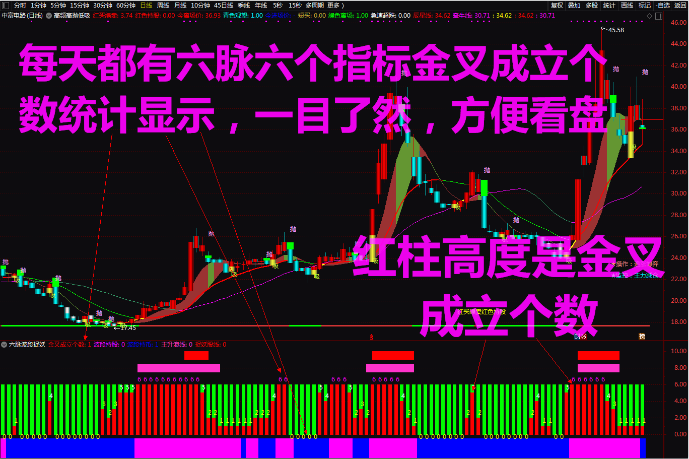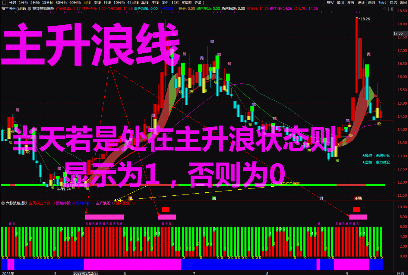 (六脉神剑最强升级版有波段、主升浪和捉妖股提示,多个指标公式整合为一个副图。送一主图两个选股公式。)