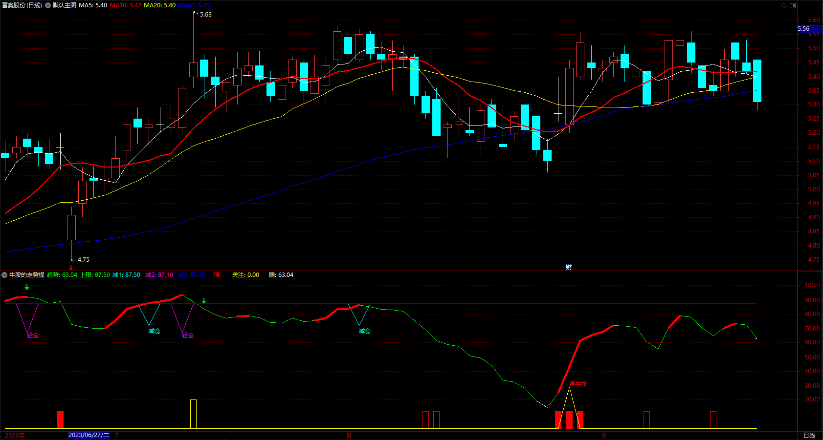 减3:IF(FILTER(CROSS(95,趋势),3),62,87.5),COLORBLUE;
