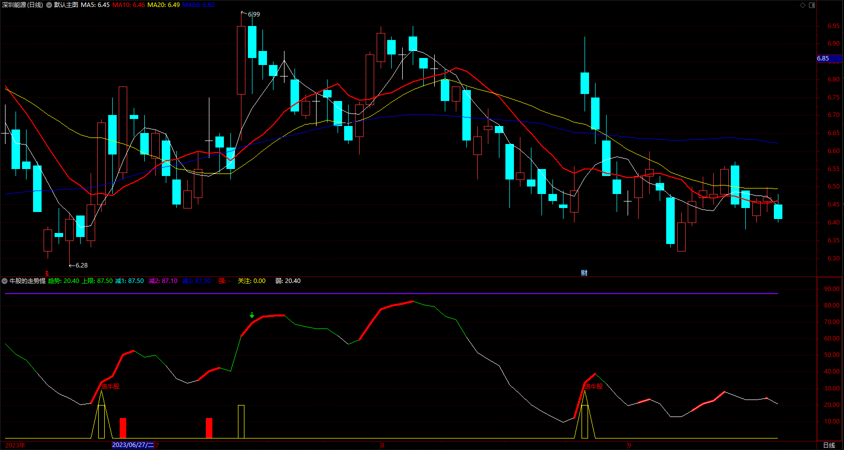 弱:IF((C<MA(C,60)),趋势,DRAWNULL),COLORWHITE,LINETHICK1;
