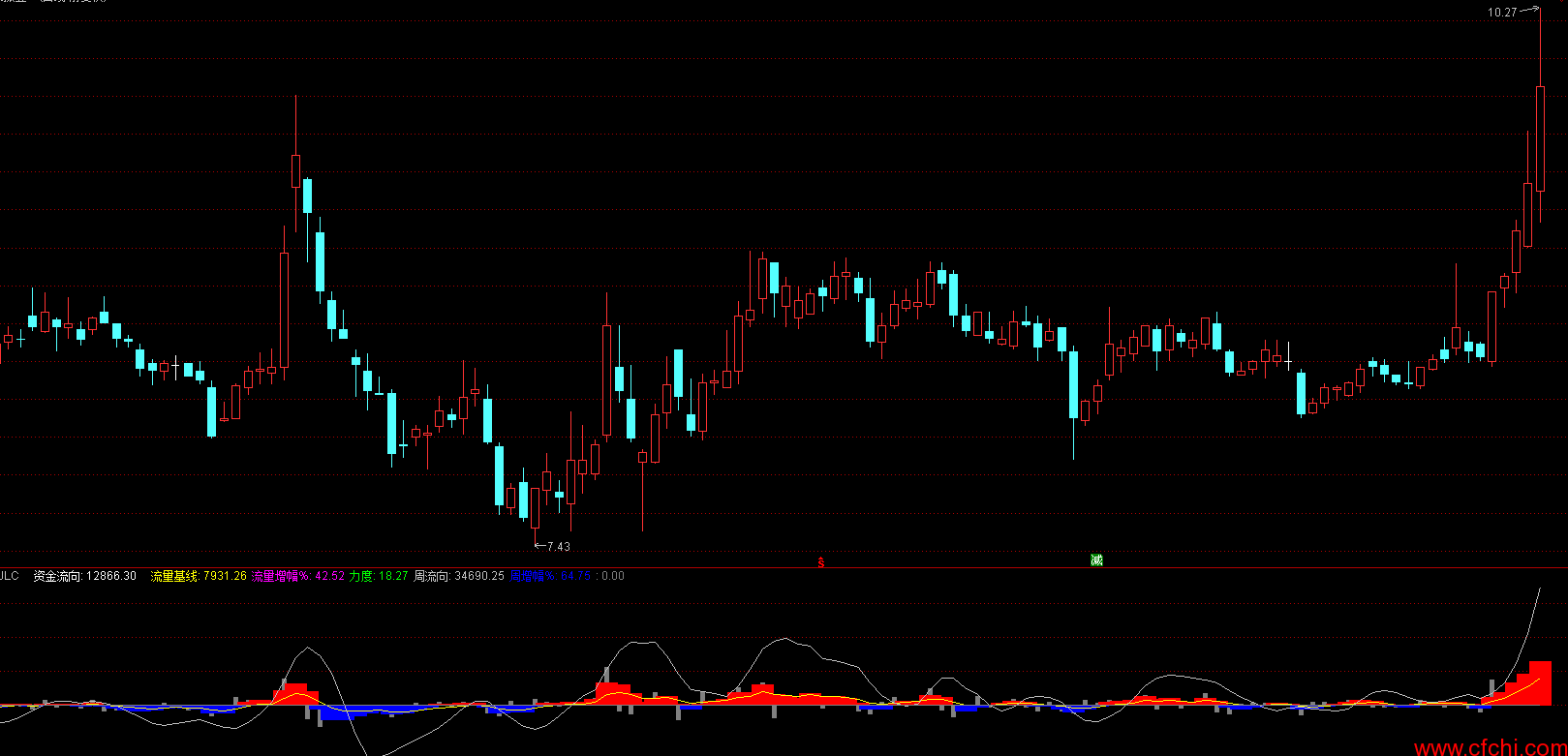 STICKLINE(资金流向<0,资金流向,0,7,0),COLORFF0000;