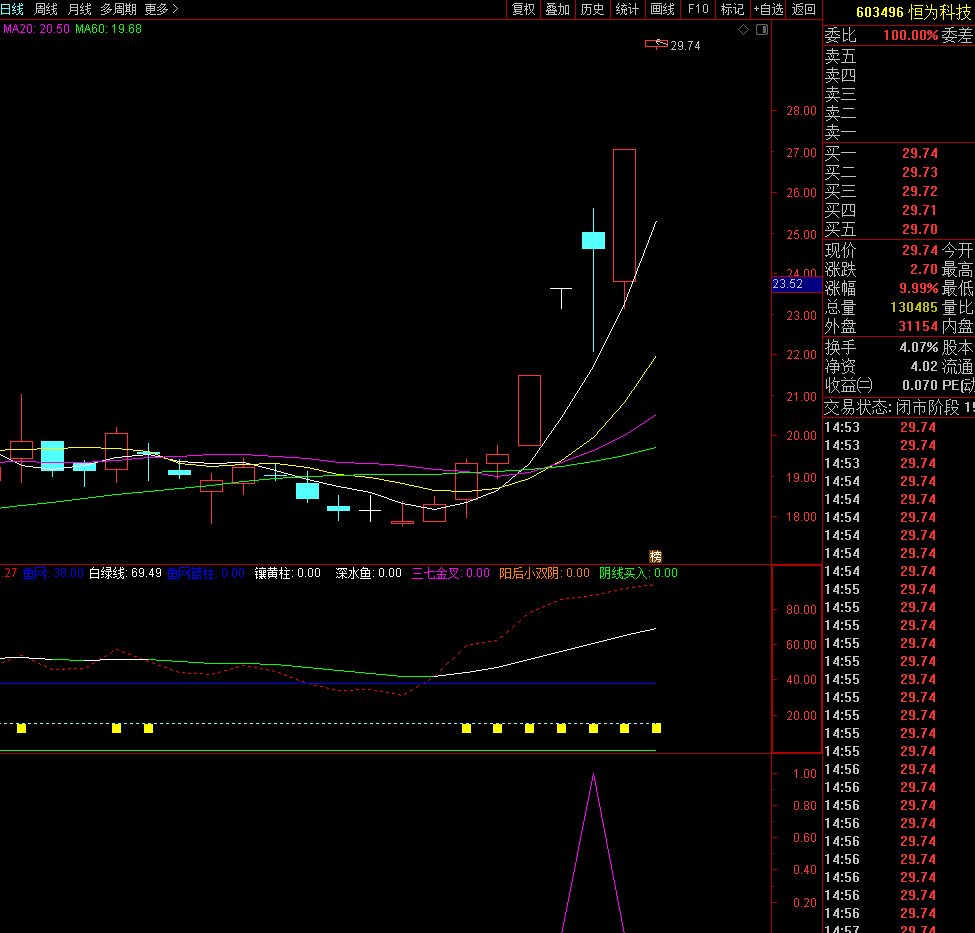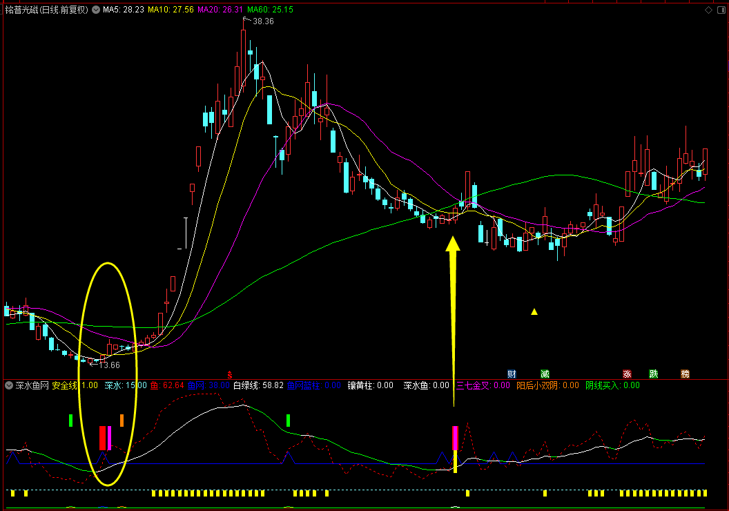 深水鱼网副图:绿柱阴线买入!(下降趋势当中续谨慎);红柱、紫柱为短期加仓介入点。可配合倍量阴线擒涨停使用。