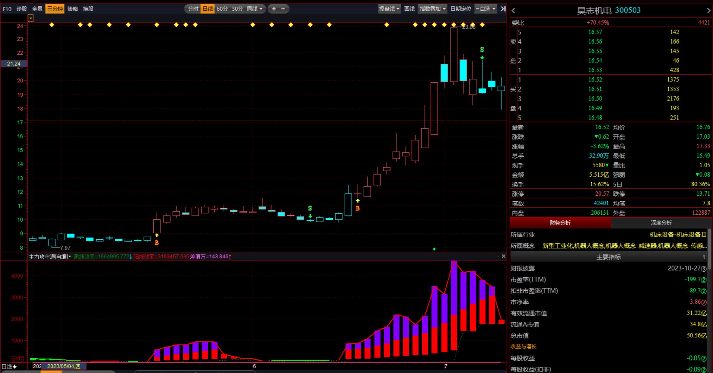 3)结合益盟操盘线,如果长期跟踪一只标的,当阳线效率上穿阴线效率,即红色指标线上穿绿色指标线,可以作为一个介入点或加仓点,常常可以捕捉到比益盟操盘线早一些的介入买点,而且益盟指标副图也可以选股,设置阳线效率上穿阴线效率做选股,就可以筛选这样的金叉介入点,如果红线上穿绿线且角度陡峭,同时操盘线也出现B点信号,可以作为短线买卖的很好的介入点。