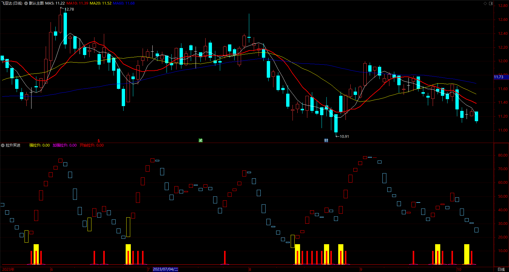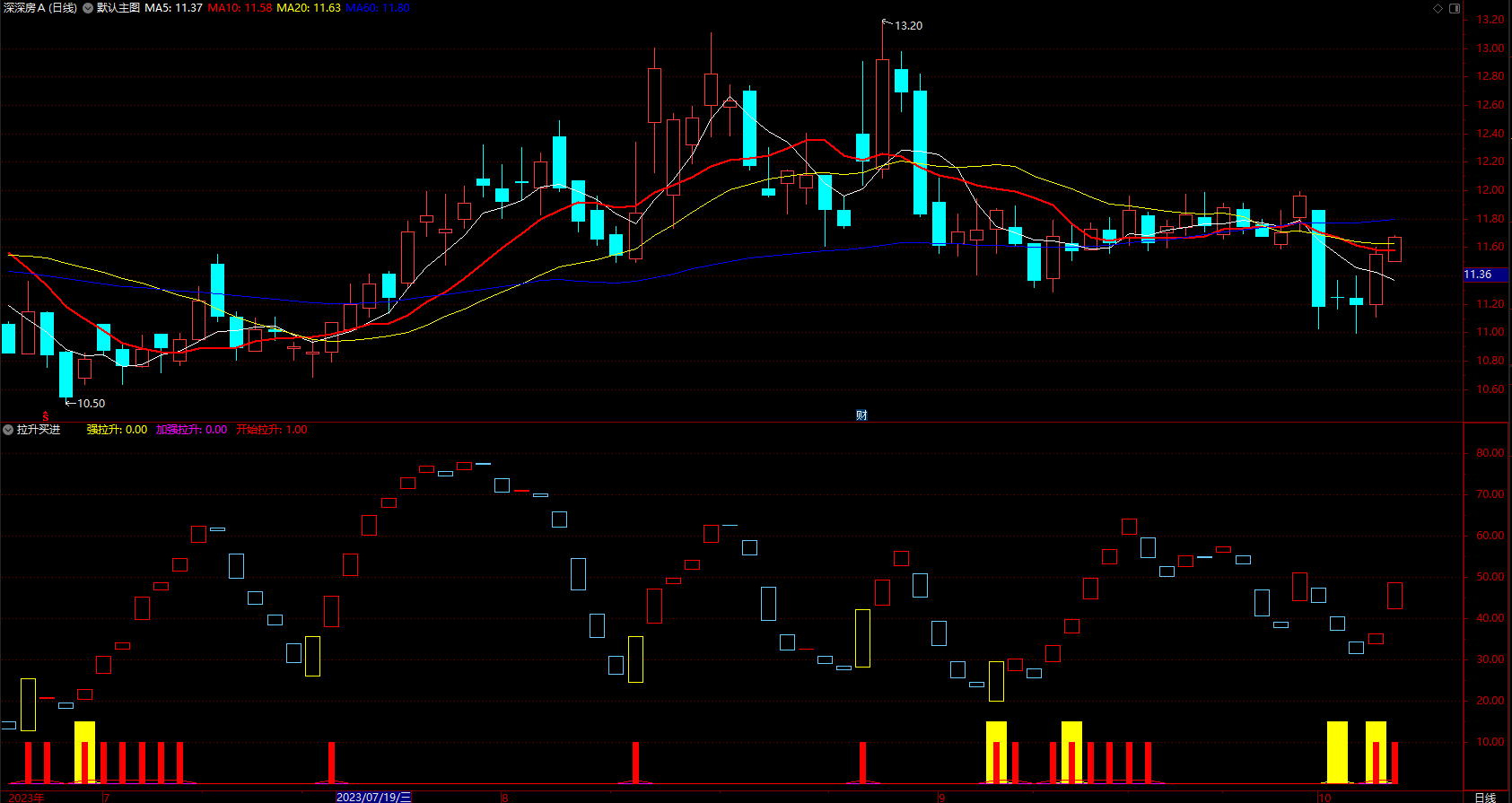 开始拉升:STICKLINE(地>天 AND 地<0,10,0,1,0)=1,COLORRED;