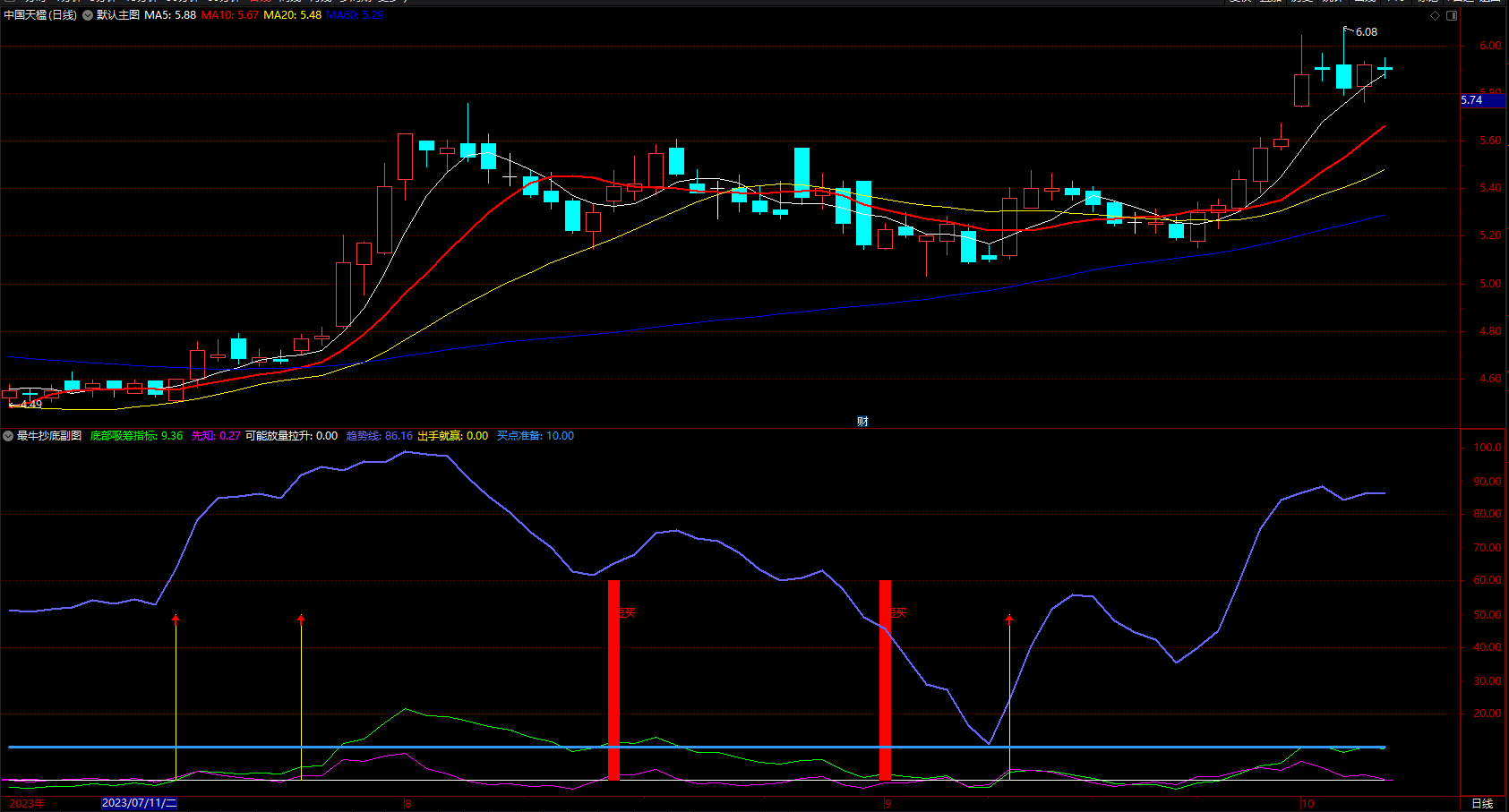红色箭头提示上涨趋势 出现后等收盘价站上10日线在买进