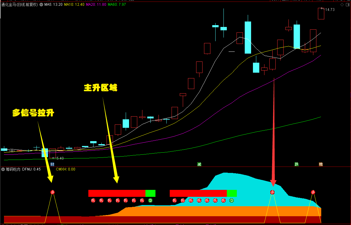 筹码吃肉副图:研究筹码找突破点,并拿住波段主升浪、逃顶!