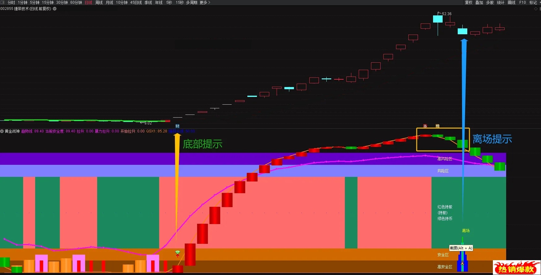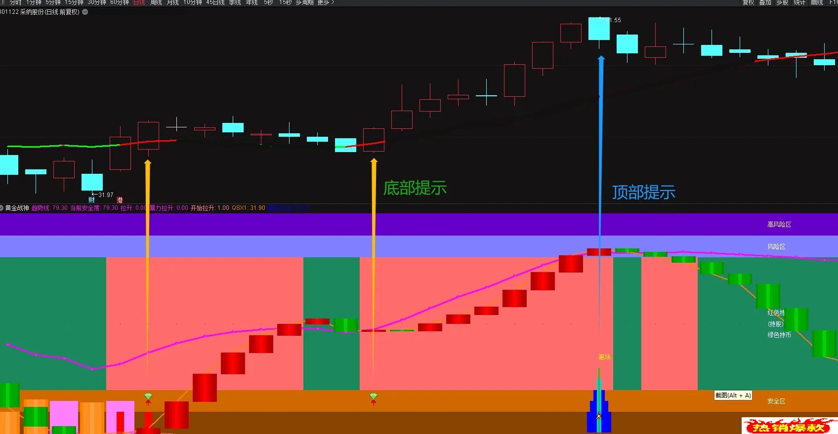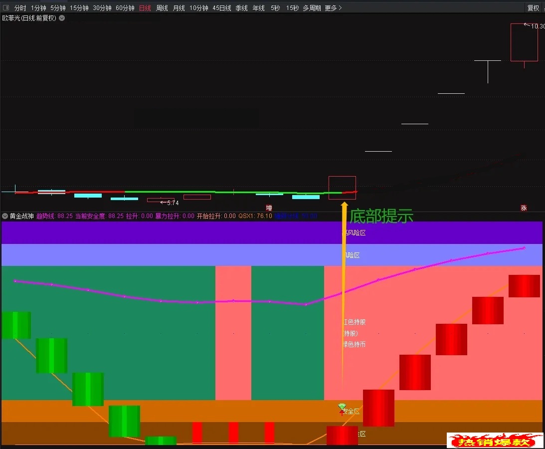 1.【区域划分】紫色为高风险区,需谨慎;橙色区域为安全区,可结合其他指标考虑上车;中间区域红色区持股,绿色区持币。