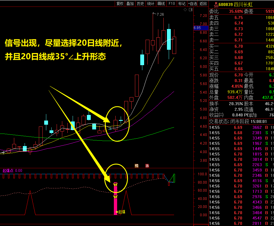 信号出现时,尽量选择股价在20日线附近,并且20日线成35°∠上升形态,为理想介入时机!