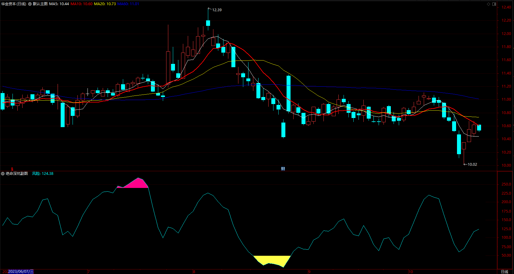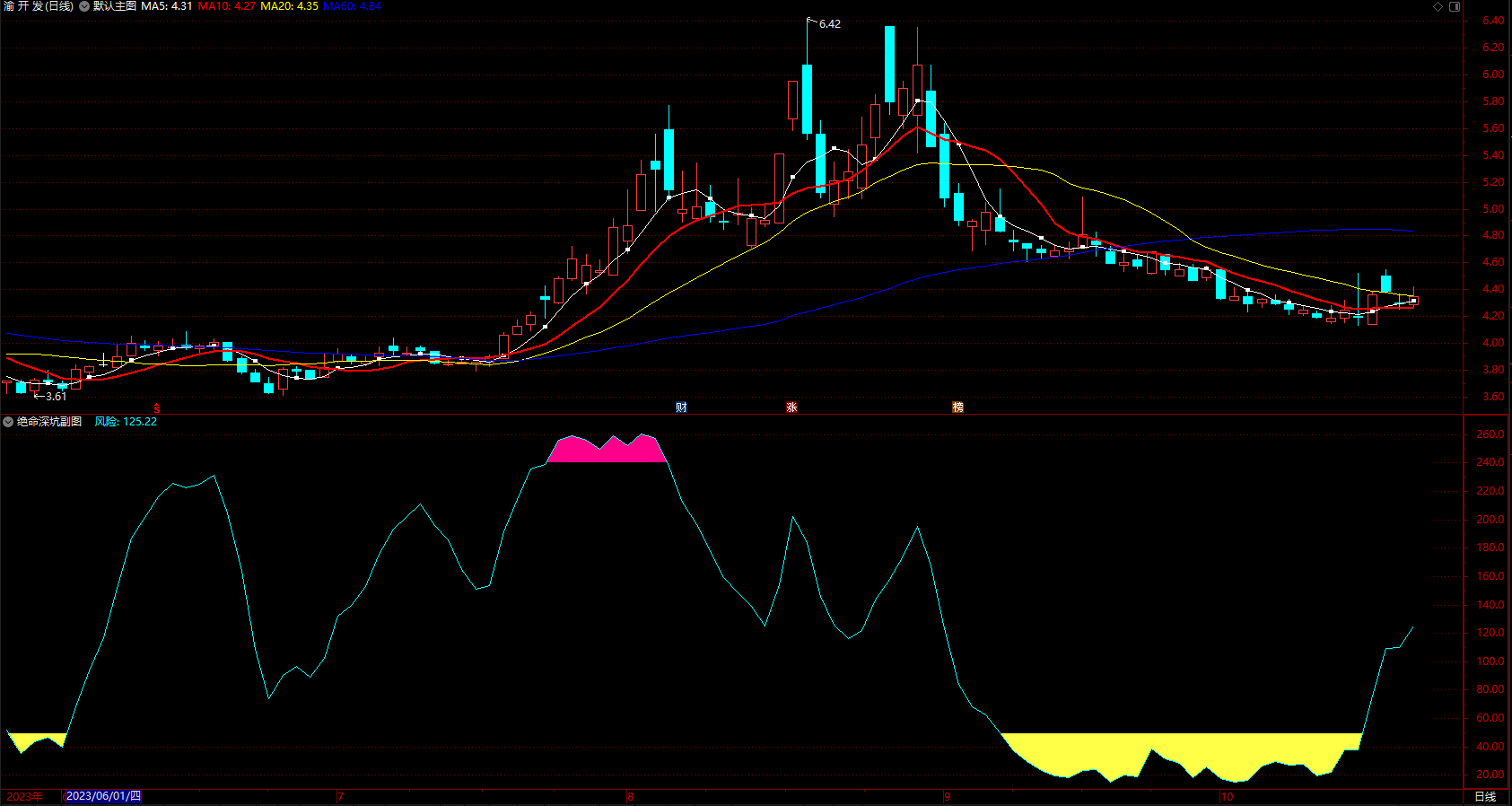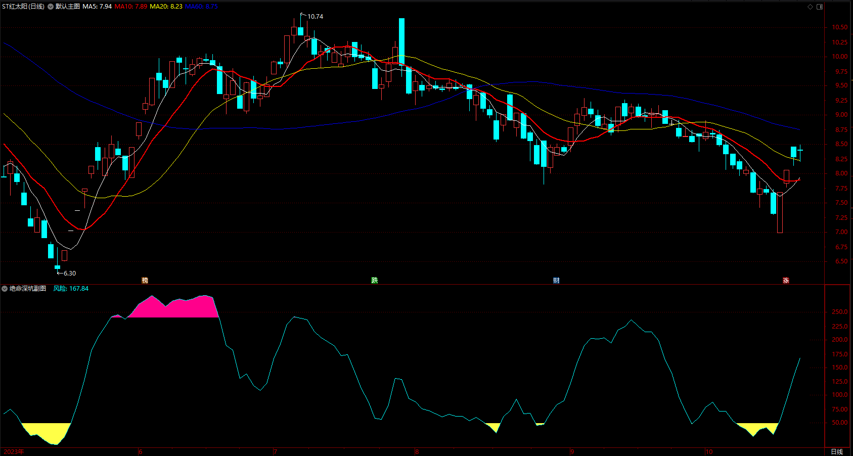 1、该指标比较简单,只有两个信号,一个底部的黄色深坑区,一个顶部的红色风险区。