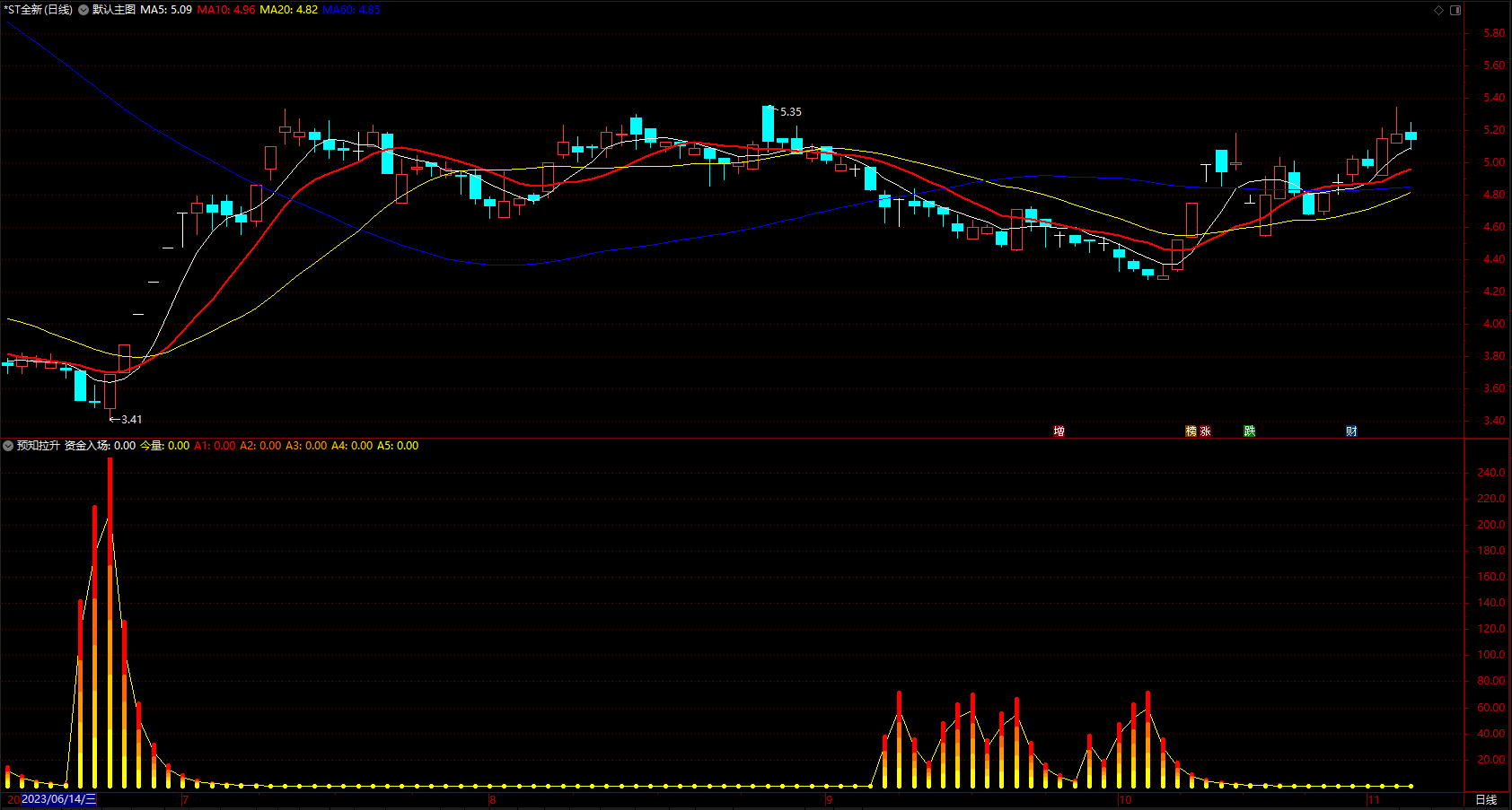 A3:IF(资金入场>0,今量*0.6,0),STICK,LINETHICK5, COLOR0099FF;