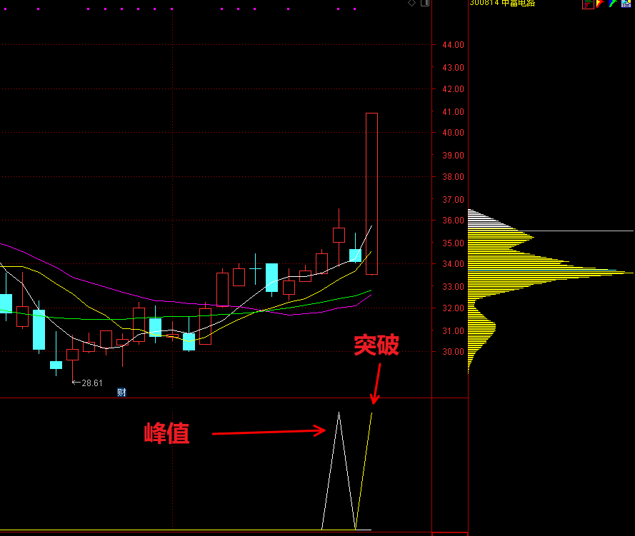 白色凸起为筹码峰值,黄颜色凸起为筹码突破!