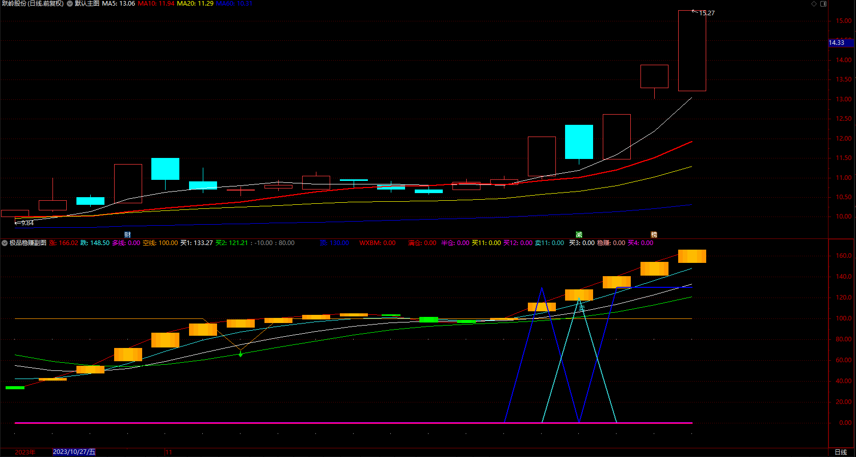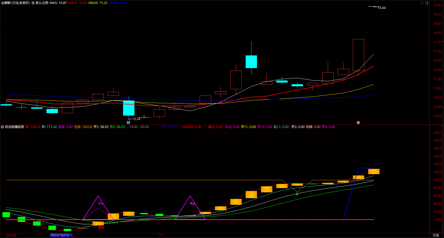 半仓:IF(((ZJZ>0 AND JBJ>0 AND SUM(VOL/CAPITAL*100,5)/5<1) OR (CXC>0 AND REF(C,1)/REF(C,2)>0.902)) OR (((ZJZ>0 AND JBJ>0 AND SUM(VOL/CAPITAL*100,5)/5<1) OR CXC>0) AND (LXL<0 OR LGL>0)) AND VMC<10 ,100,0),COLORMAGENTA,LINETHICK2;