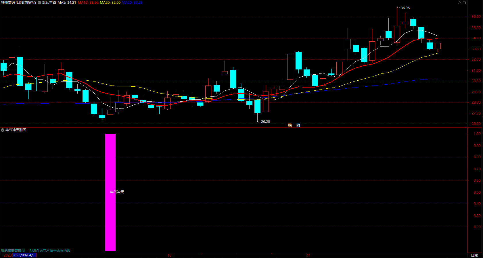 牛气冲天 副图买进点 玫红色柱买进