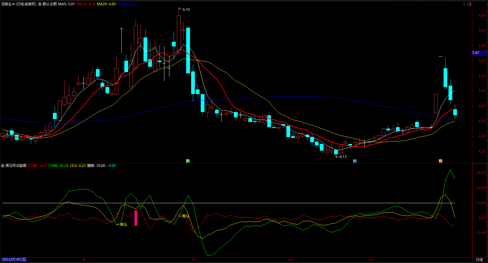 黑马:DRAWTEXT(FILTER(XGD,10)&&MA(C,60)/REF(MA(C,60),1)>0.02&&抄底高手>0,CO和,'←黑马'),COLORYELLOW;