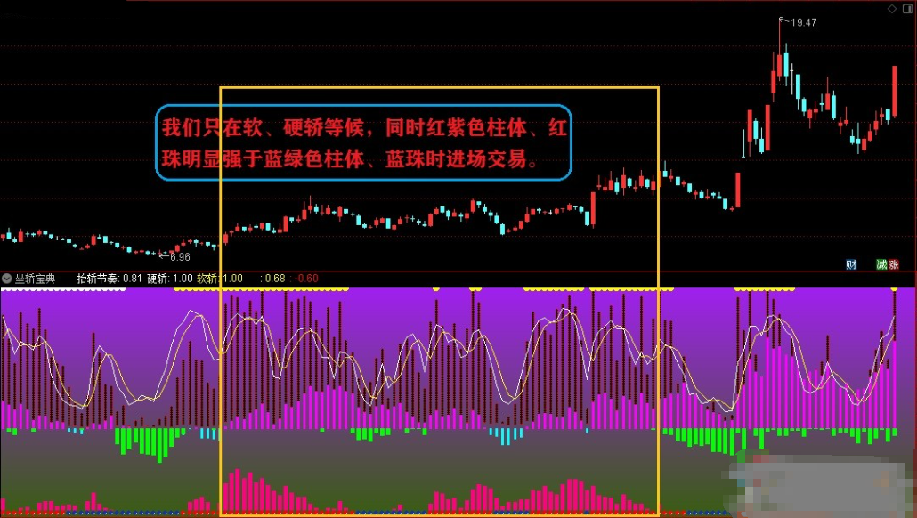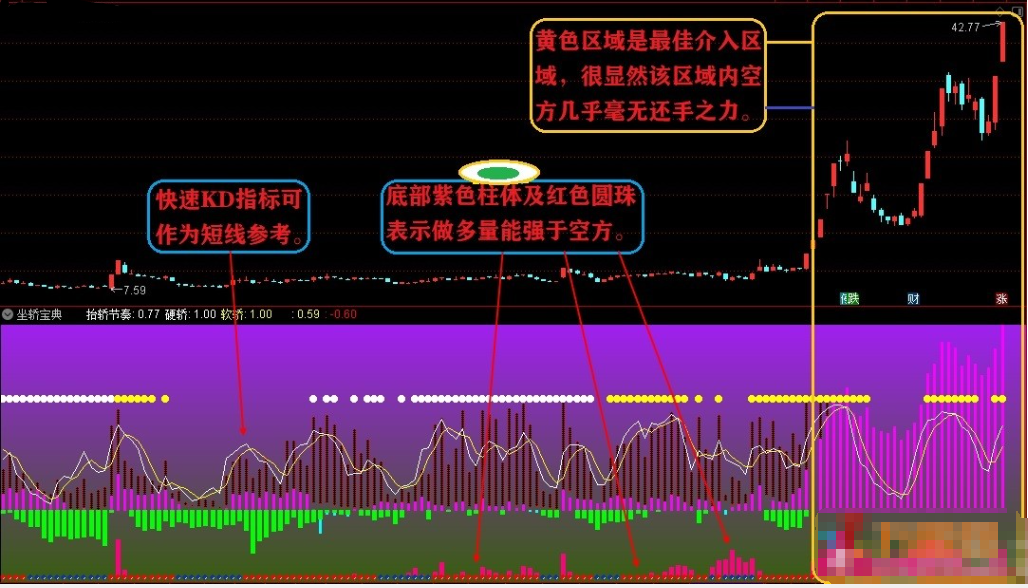 贴图中详细表述了指标的使用方法,黄框区域是最佳介入点,也是抛压最轻的位置,让机构主力为你抬轿吧!