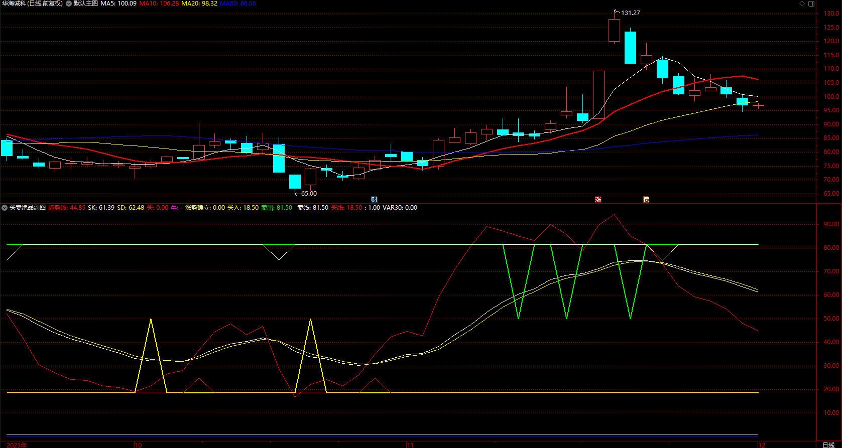 牛1:=IF(SD>18 AND SK<75 AND CROSS(VAR20,VAR21) AND (VAR22-VAR23)/VAR23<0.161 AND REF(SK,3)<SK AND REF(VAR22,1)<VAR22,95,0);