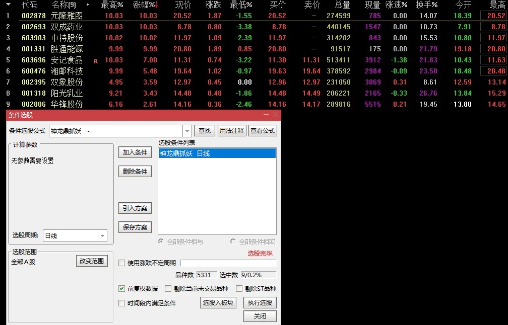 【神龙鼎抓妖】通达信神龙鼎抓妖副图选股预警指标涨幅低,设计2.5%出票!捉妖股多!东安动力 南京商旅