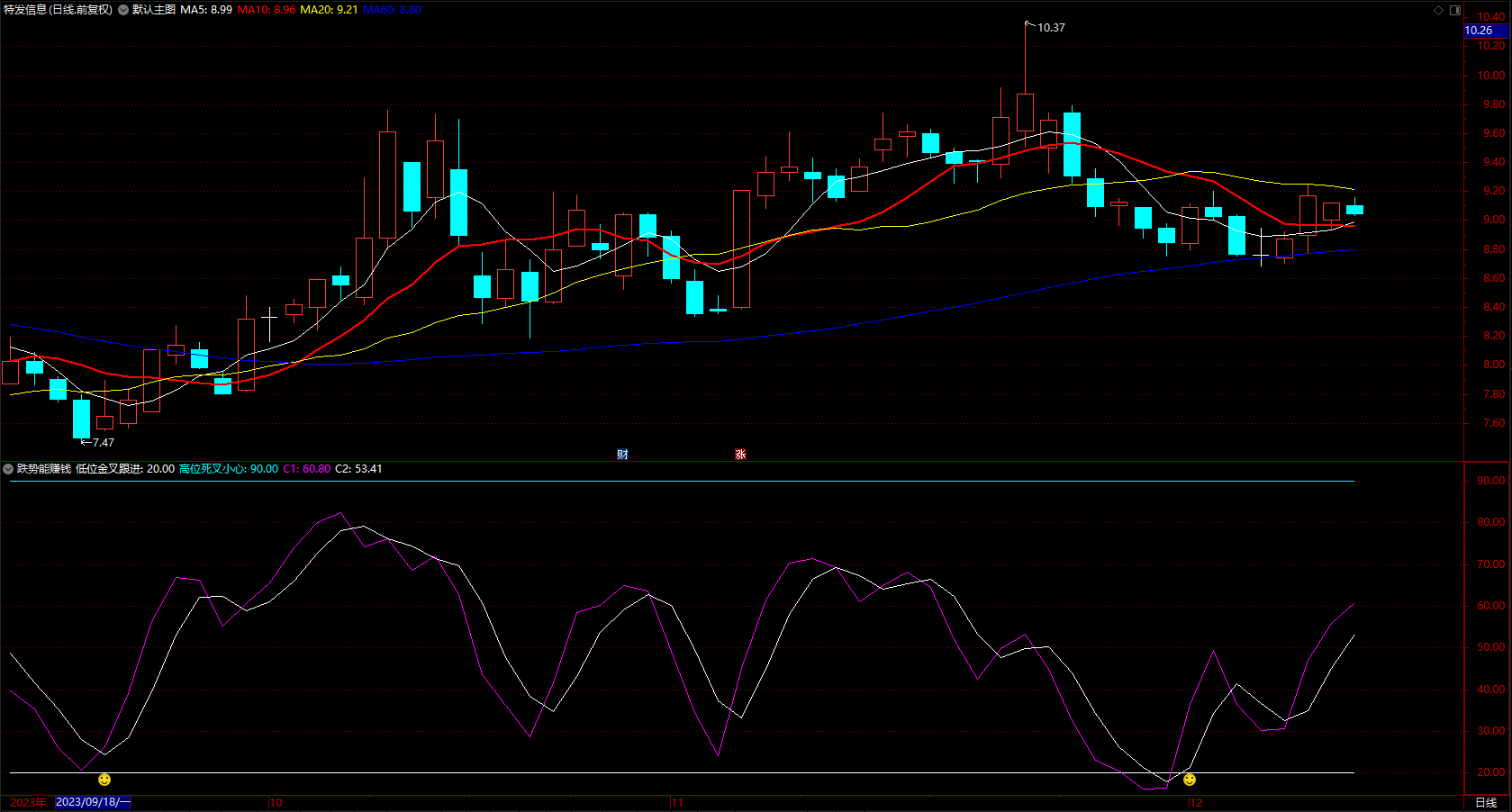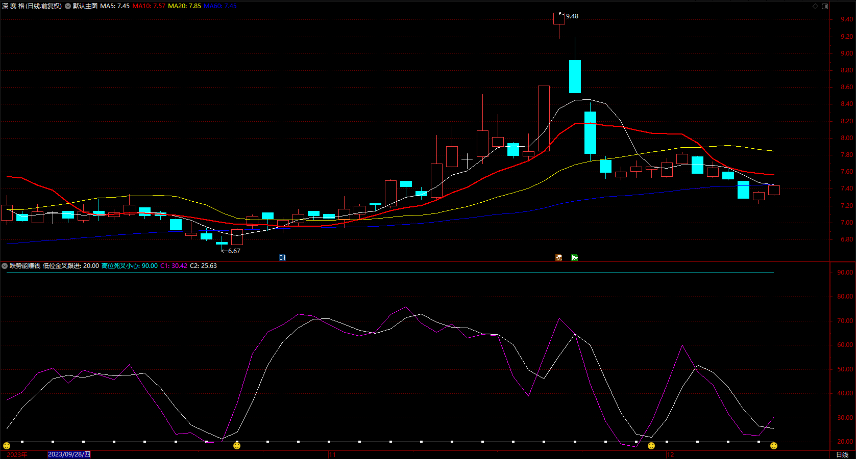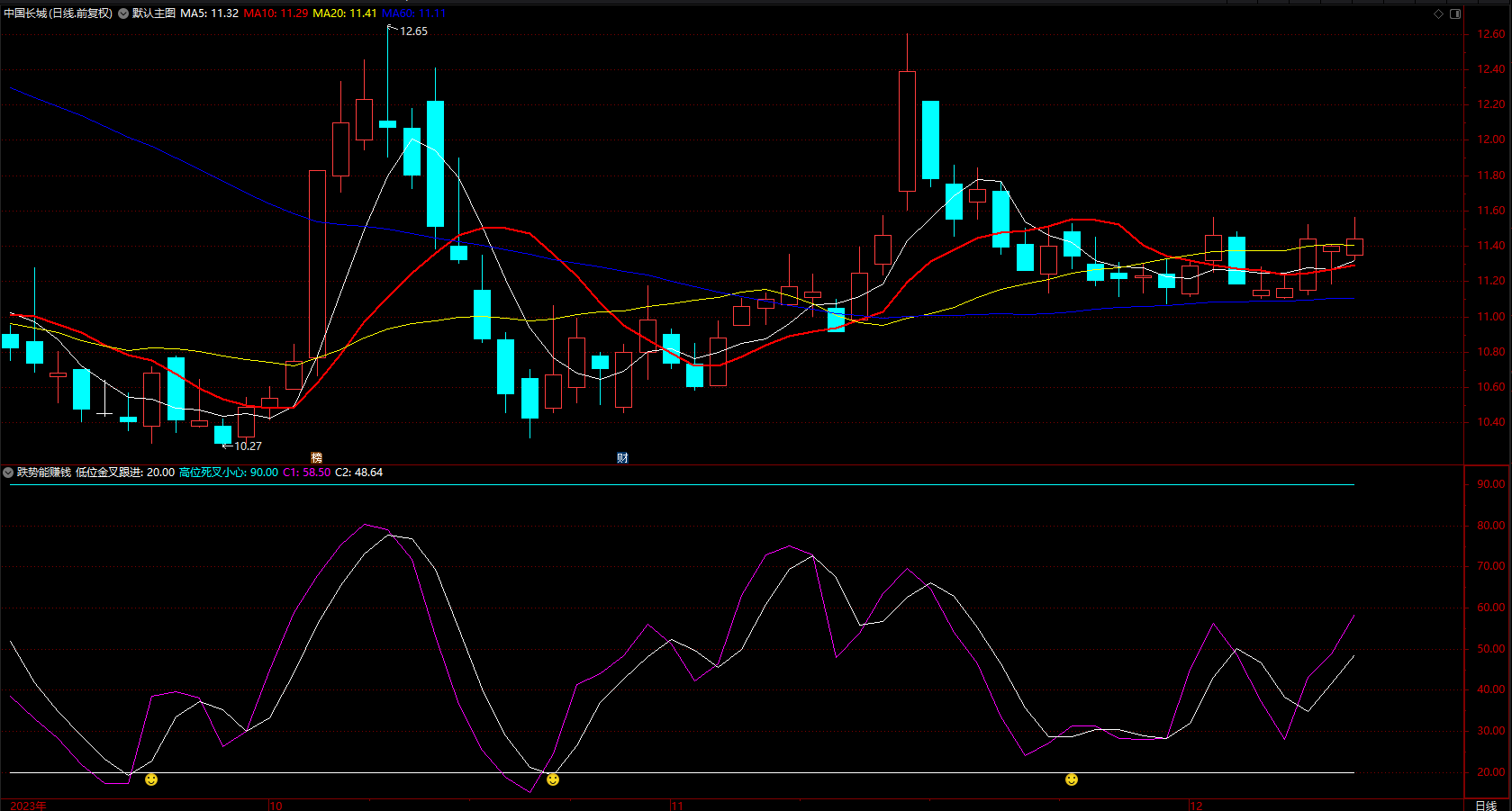 跌势也能赚钱 通达信低位金叉笑脸跟进提示副图 指示公式 无未来 源码