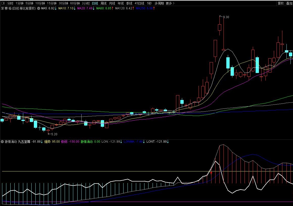 激情涌动副图:九五至尊线突破强势黄线代表趋势走强。