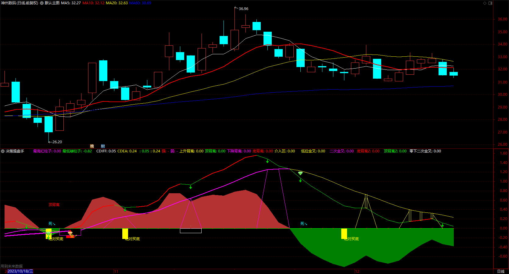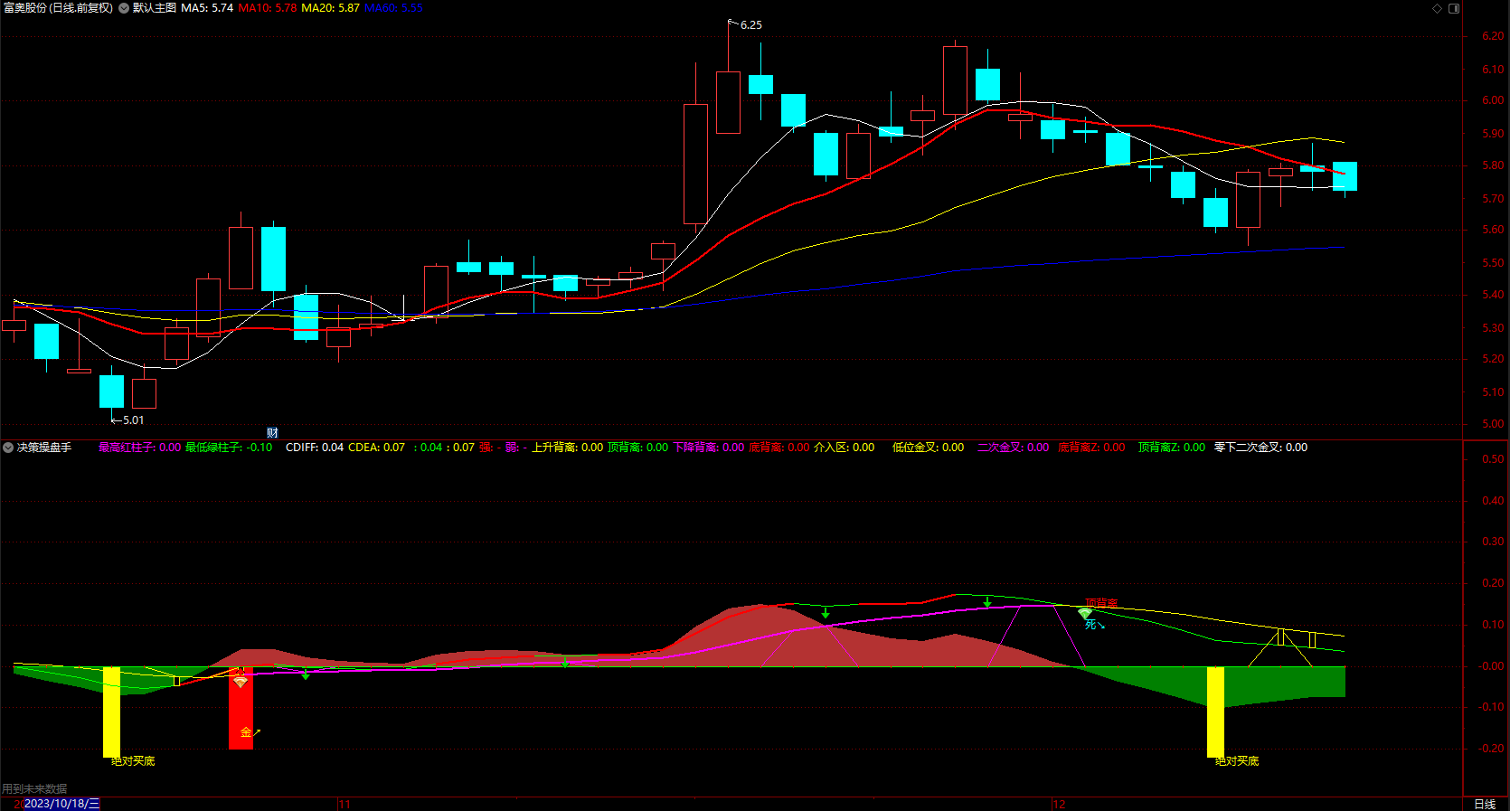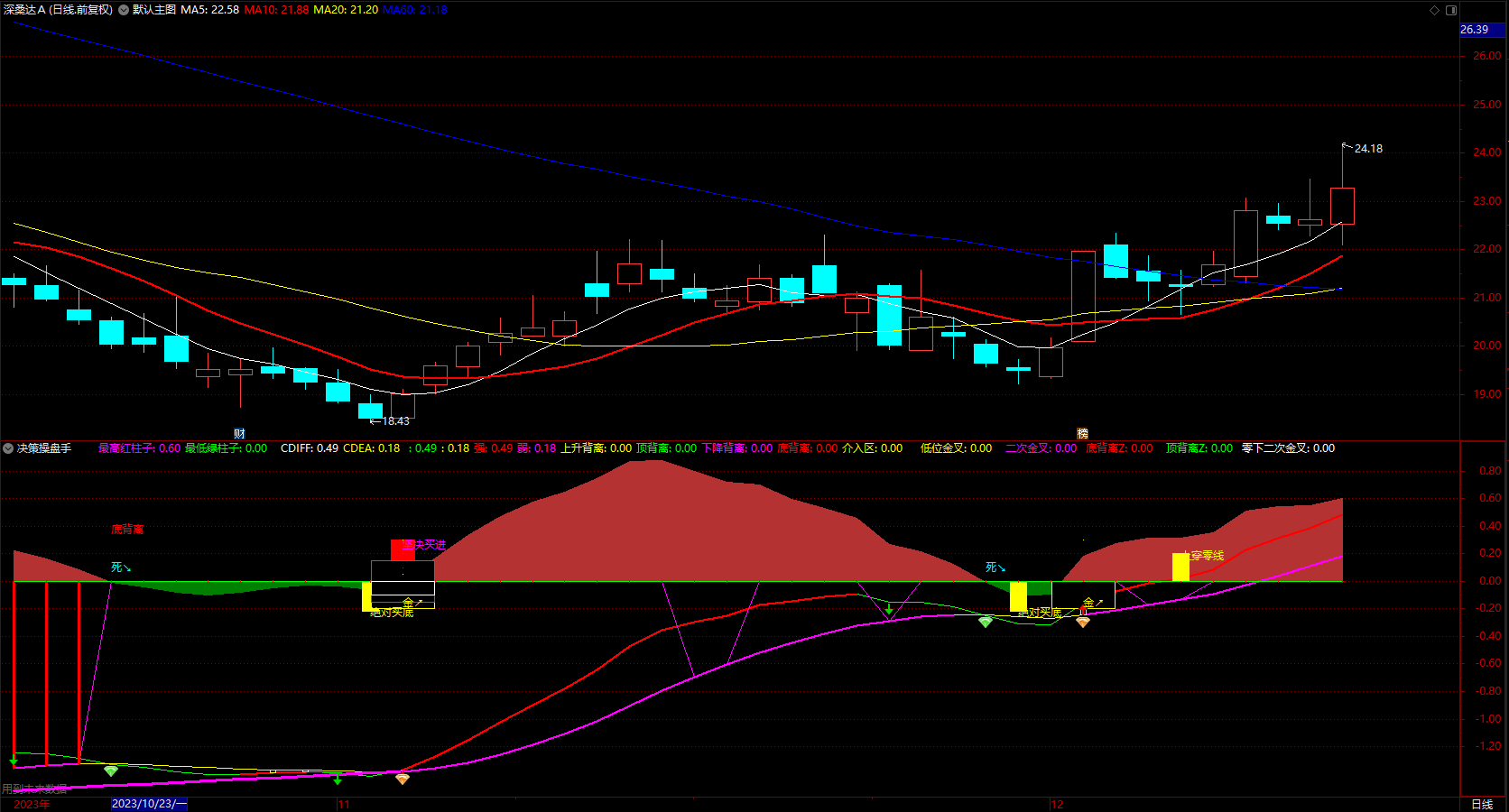 弱:IF(DEA>MA(DEA,2),DEA,DRAWNULL),COLORMAGENTA,LINETHICK2;
