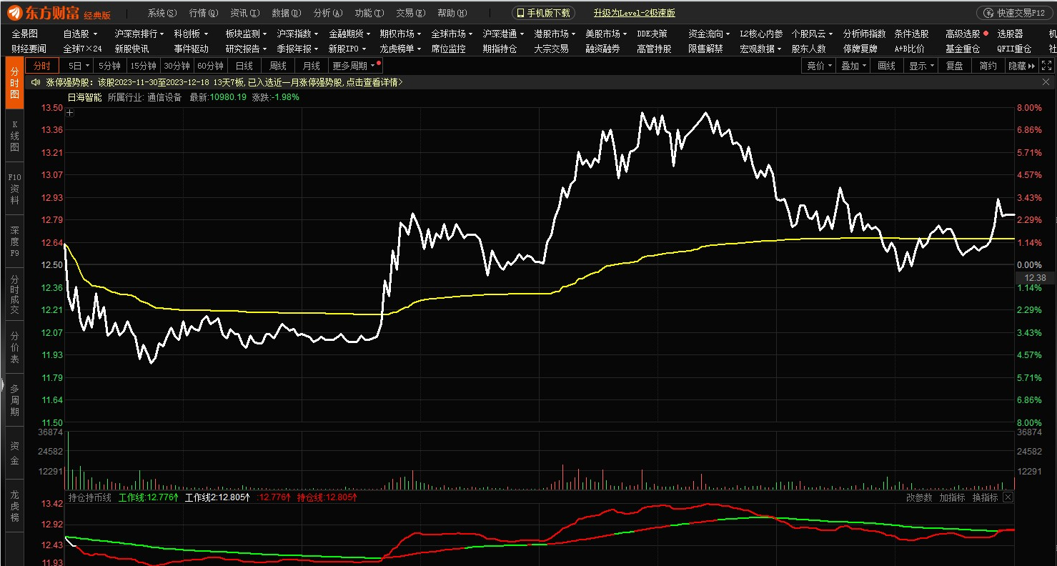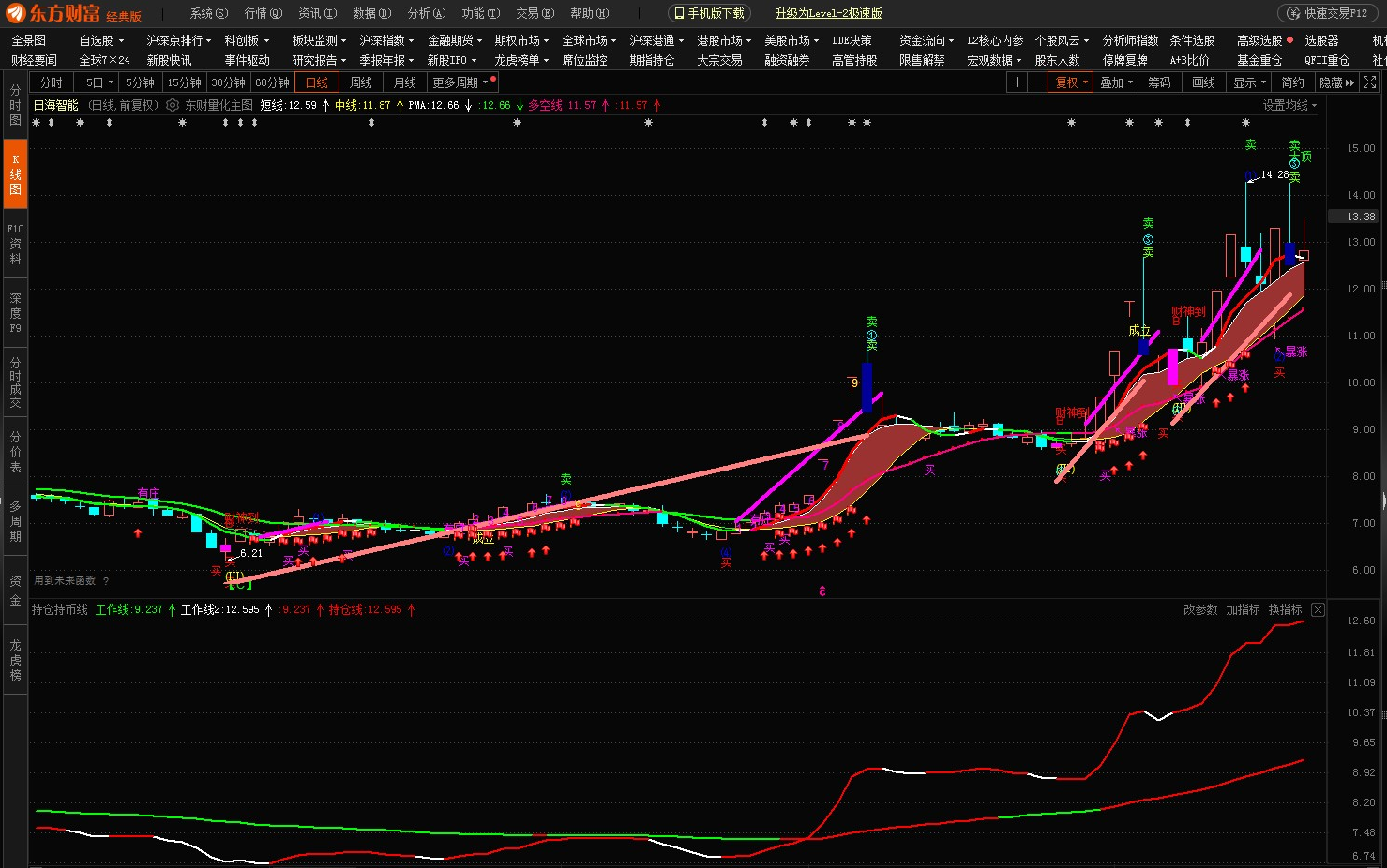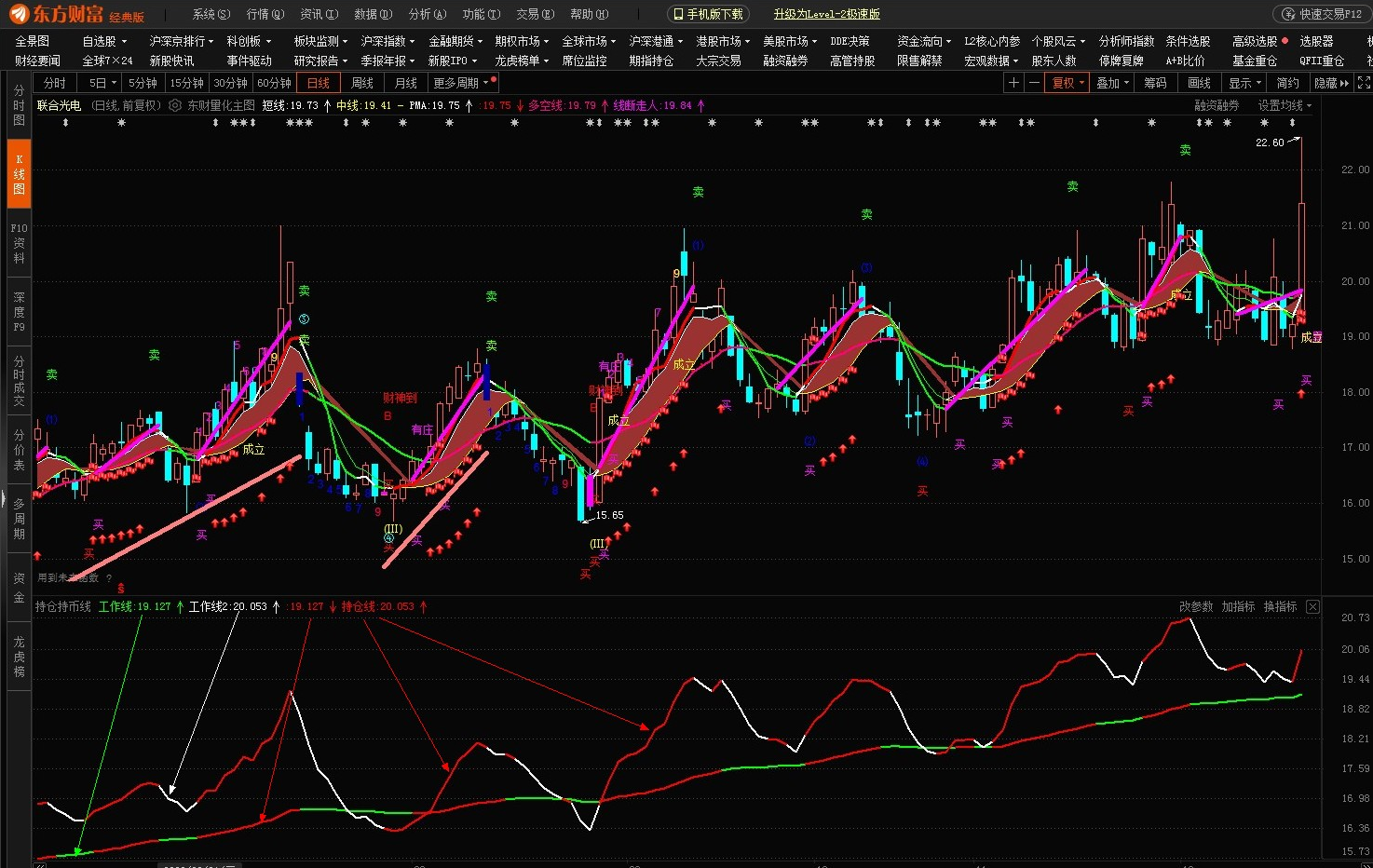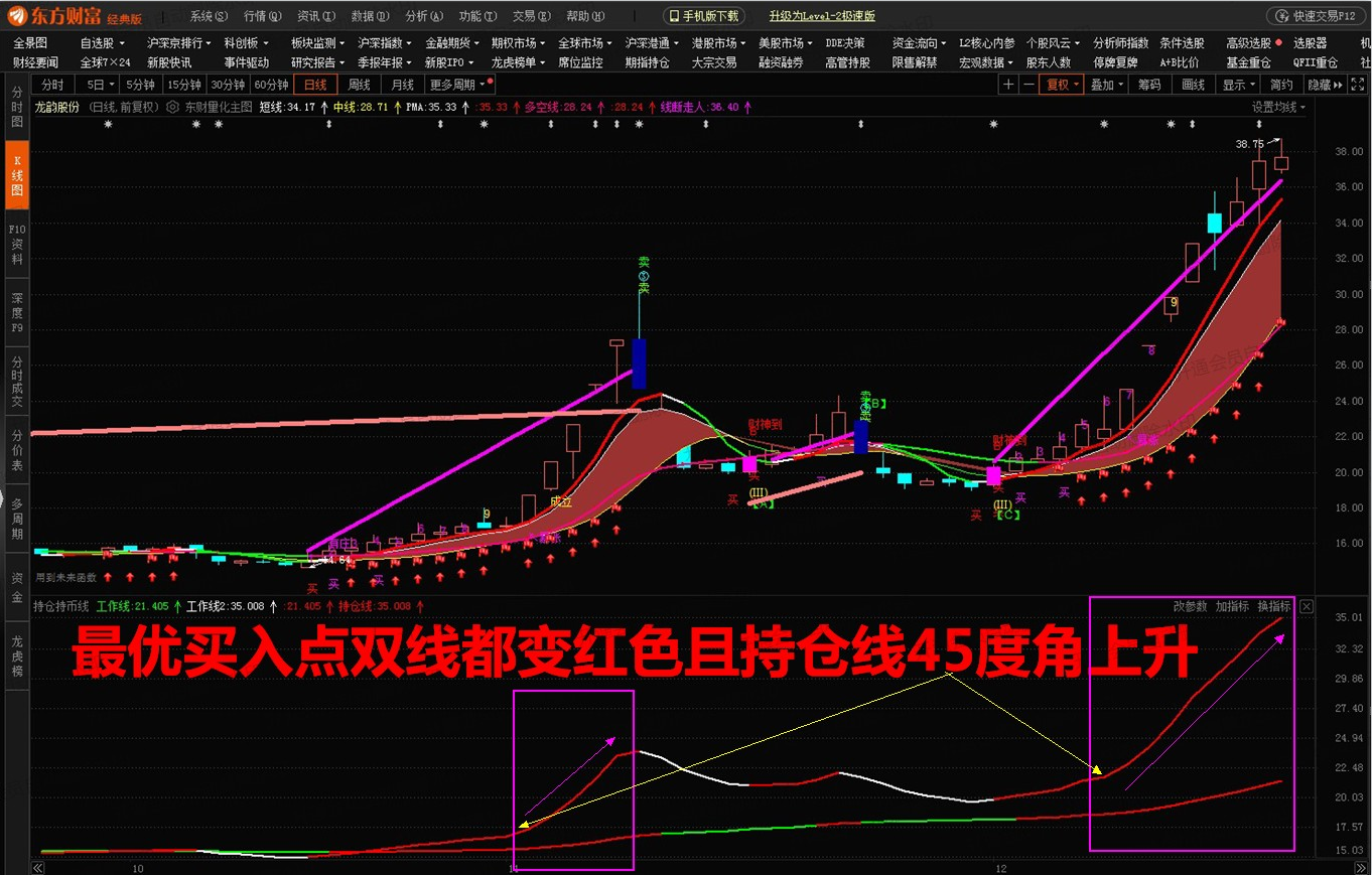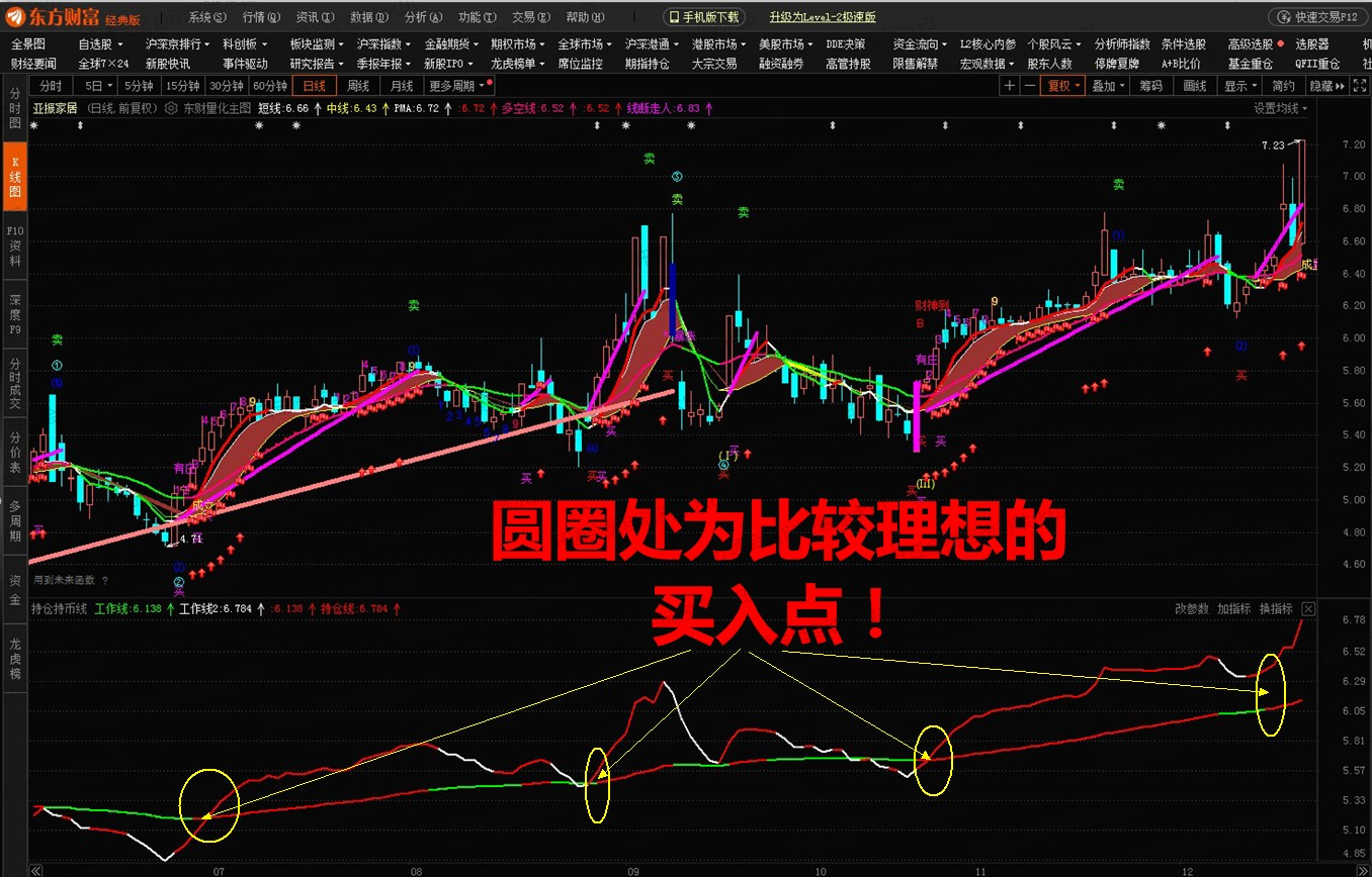 (东方财富持仓持币线副图,2条工作线刚出现都是红色则买入,只要有1条变白或变绿则卖出,操作简单。)