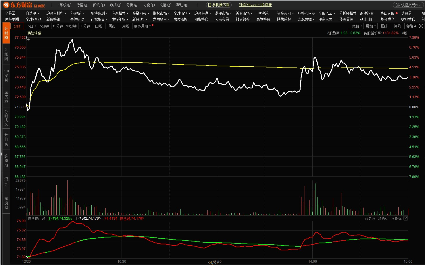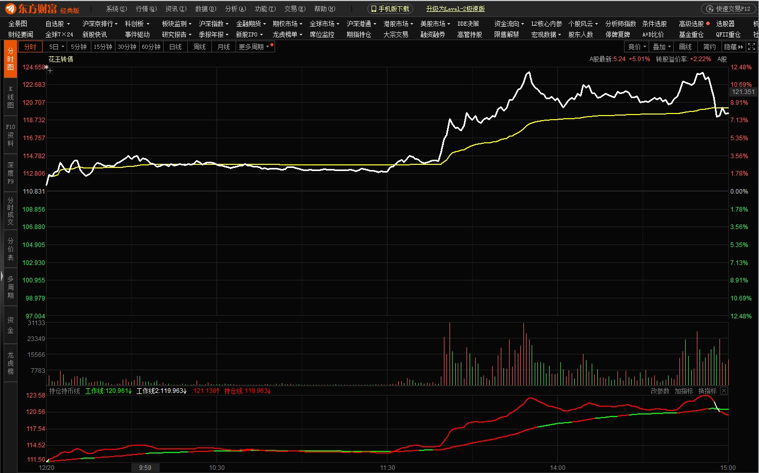 东方财富持仓持币线副图,2条工作线刚出现都是红色则买入,只要有1条变白或变绿则卖出,操作简单。