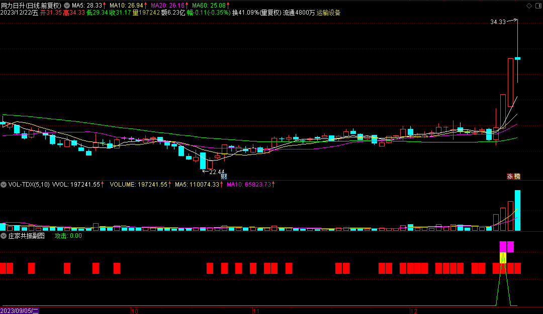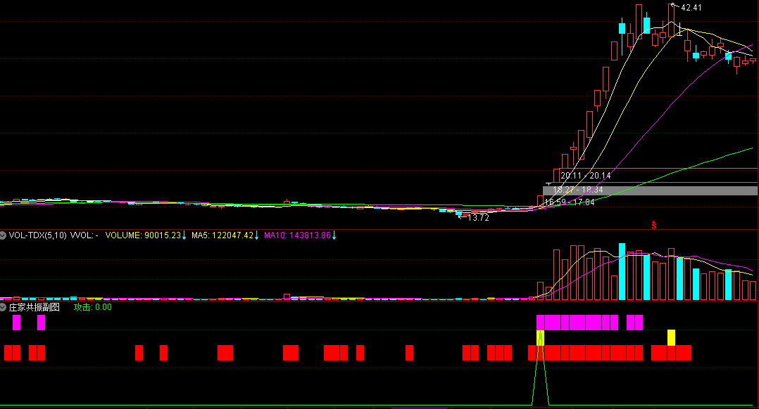 | 指标使用方法: 1、庄家共振指标中包含了三个颜色的指示,其用法也比较简单,最上面的粉红色命名为“天”,也就是“乾”,中间的黄色为“人”,下面的为红色为“地”,也就是“坤”,因此当天地人都符合条件出现的时候,我们的买点提示便出现了。 2、下面的则是配合使用的指标庄家进场指标,两指标相互配合,可的提高其成功率。 3、指标的用法也比较简单,当庄家共振买点提示出现,再配合庄家进场指标,看庄进场柱状图是否稳步上升,若是即可买入!公众号 婧琪创意 4、保守型运用时可专挑股价在短中期低位运行,又有庄家进场的票,若您是风险偏好型的,只选择不是中短期高位运行的,然后结合庄家共振的买点提示即可。 ![]() ![]() ![]() ![]() |
