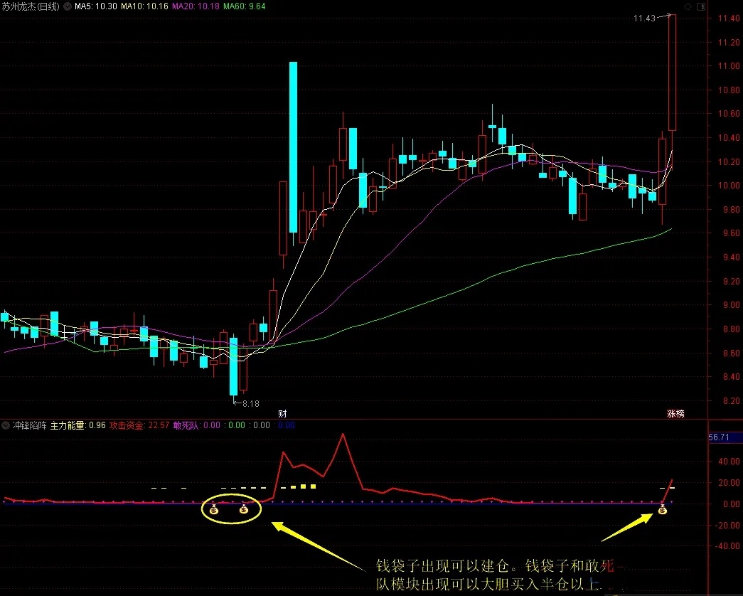钱袋子出现可以建仓。钱袋子和敢死队模块出现可以大胆买入半仓以上。主力资金攻击线出现的情况下,涨幅就会高一些,主力攻击线没有出现,那么涨幅有限。主力资金攻击线掉头朝下为卖出信号。没有主力资金攻击线的情况下,敢死队模块消失的那天就卖出。