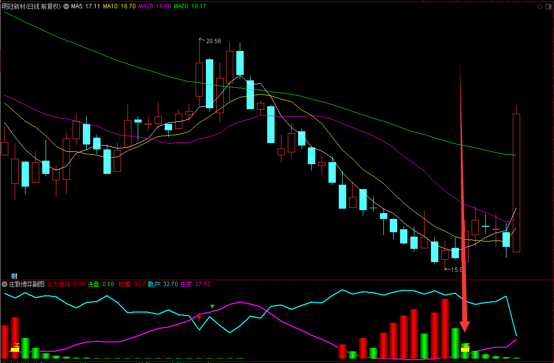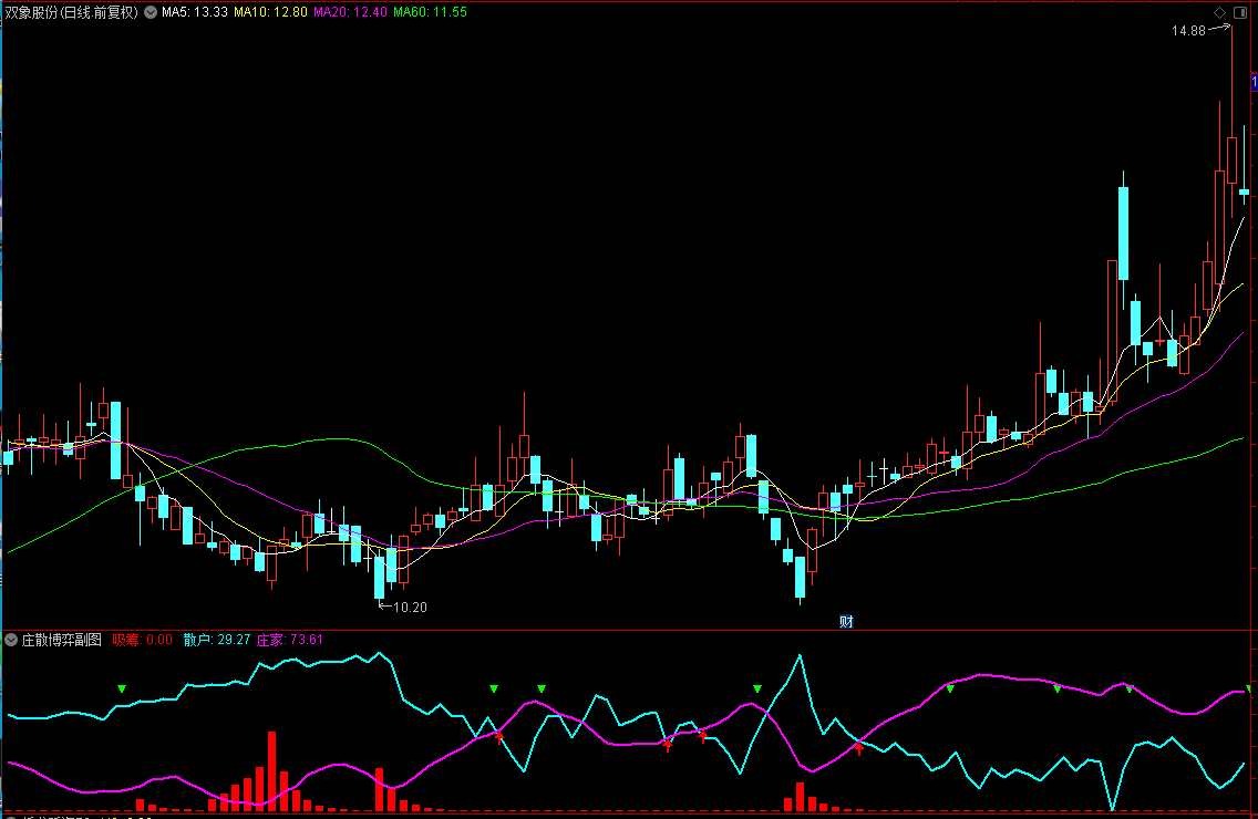(【庄散博弈】通达信庄散博弈副图指标,庄家线上穿散户线做多,简单易懂!)