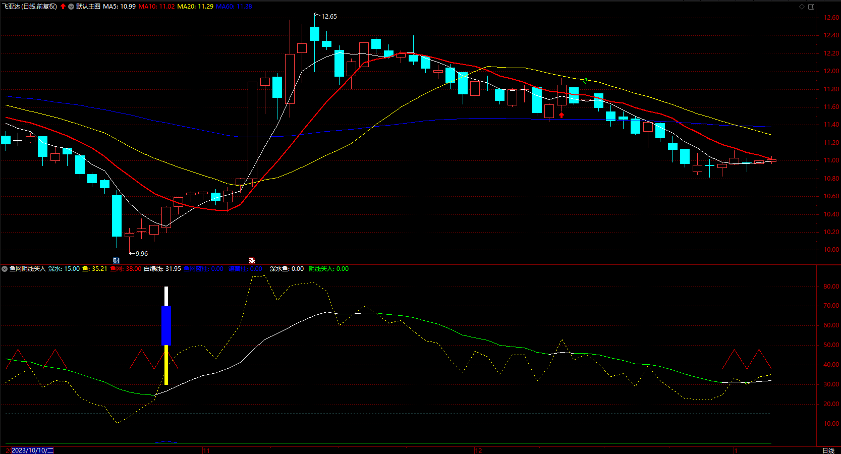 鱼网蓝柱:鱼网=48 AND CROSS(鱼,X_1) AND REF(MA(CLOSE,3),1)<=MA(CLOSE,3),COLORBLUE;