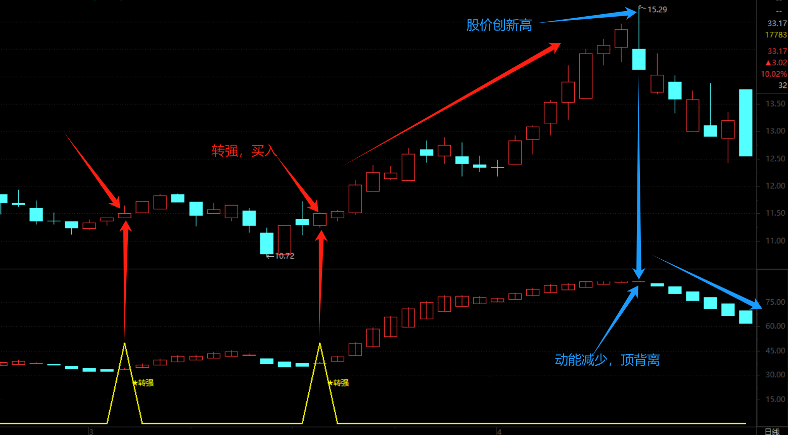 公式在相对低位出“转强”信号后可关注,然后配合红色动能持有,待红色动能减少或蓝色出现时,可卖出或减仓!