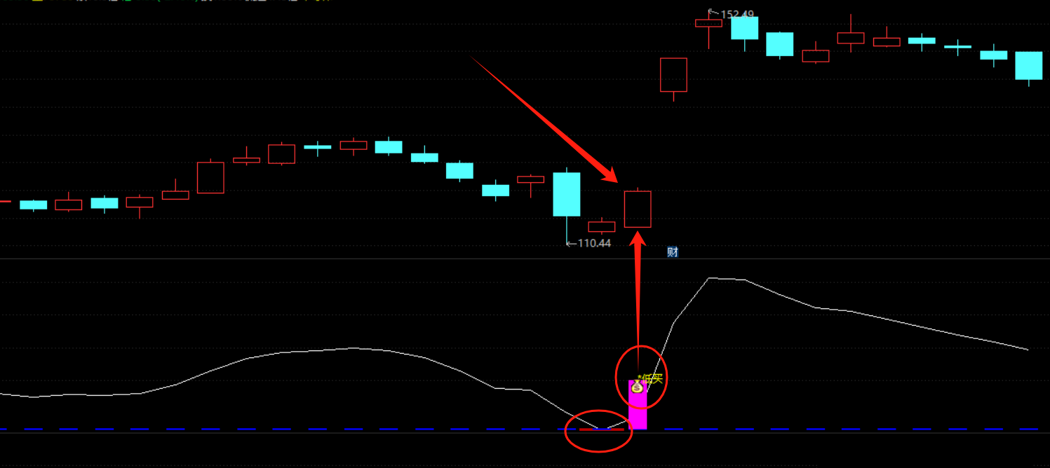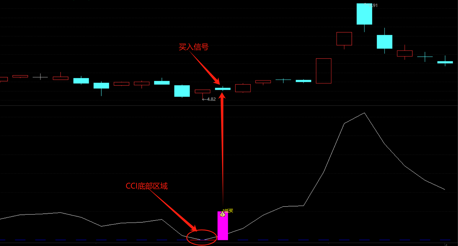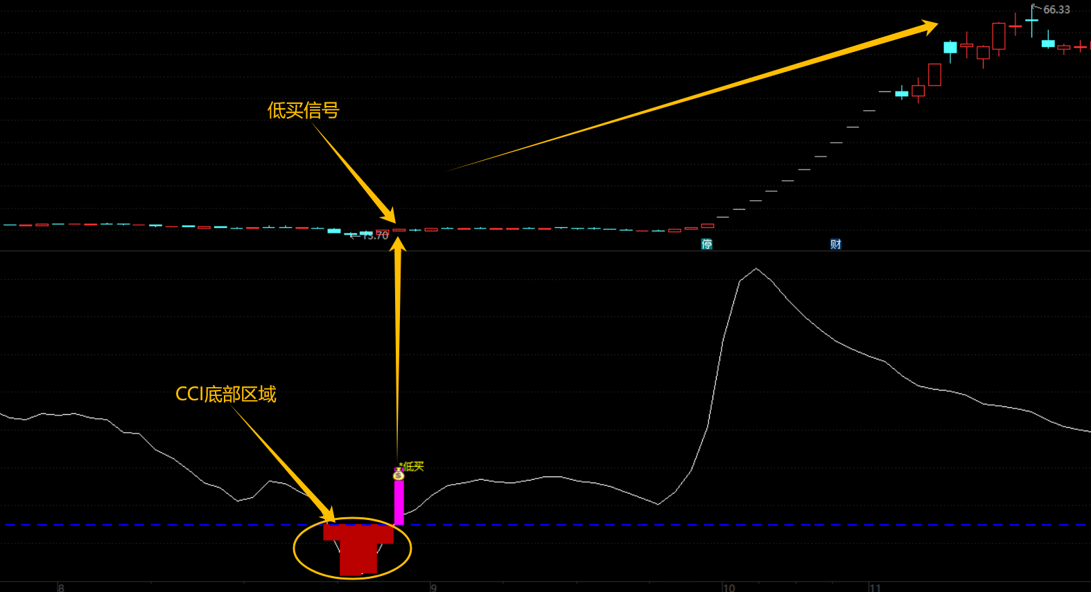 5、当CCI从"红色块状“区域再次上穿-150时,出现“低买”信号,可选股。