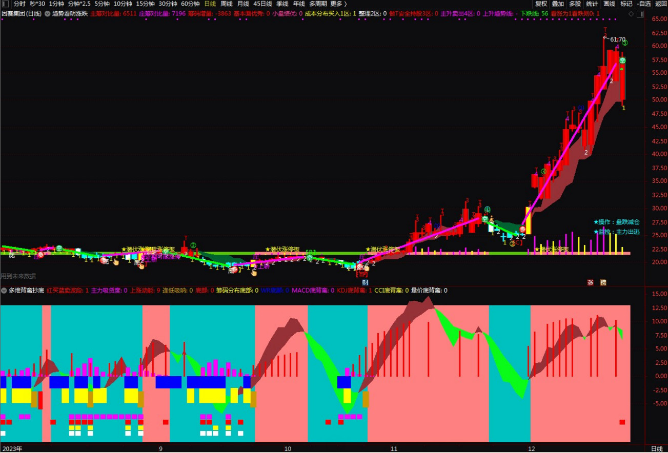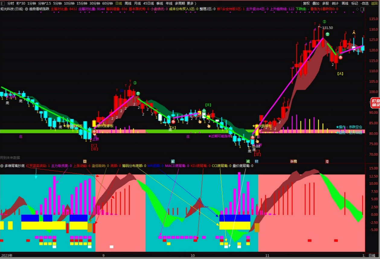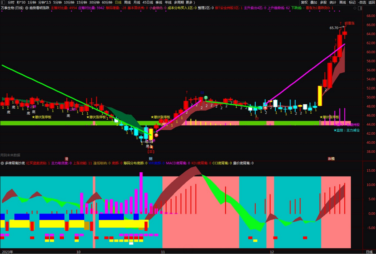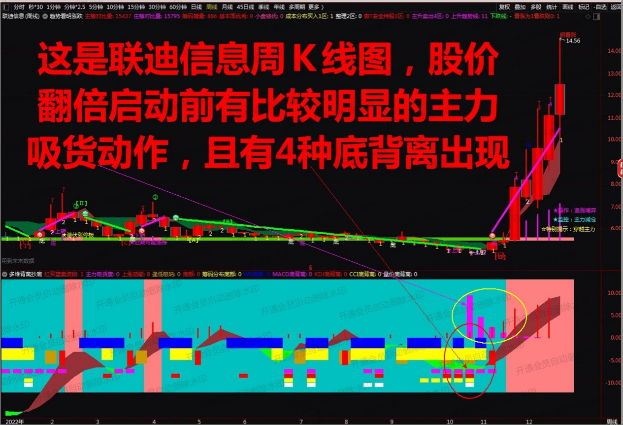 (多维背离抄底副图,有4种底背离,有4种底部区域,有2个波段指标,有主力吸货,上涨动能。抄底指标。)