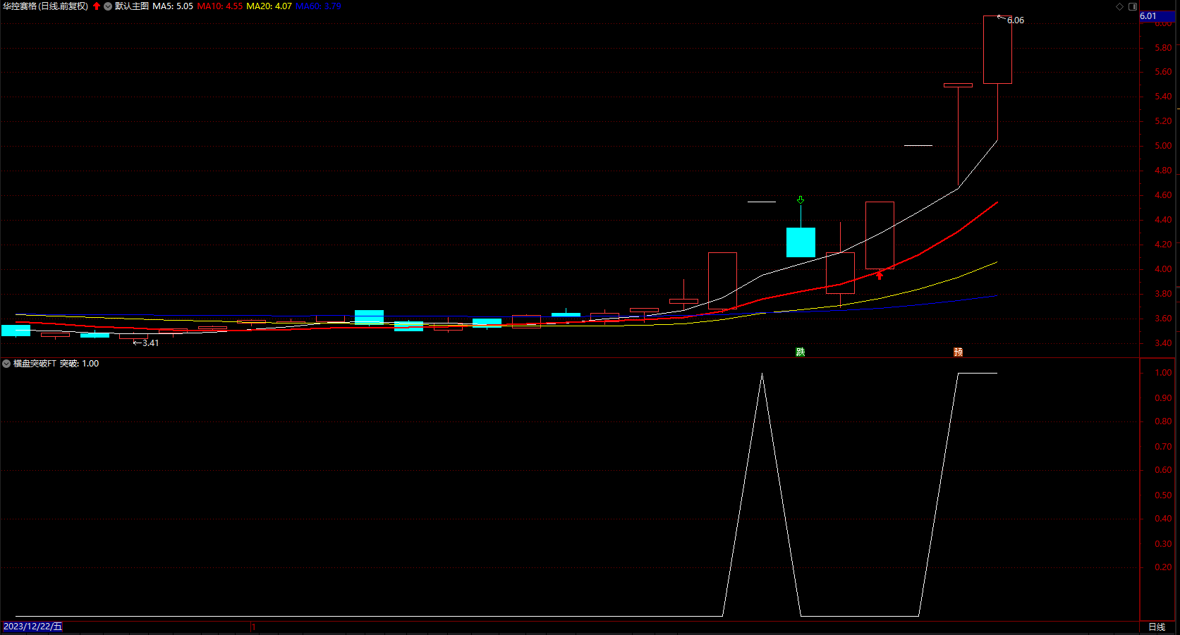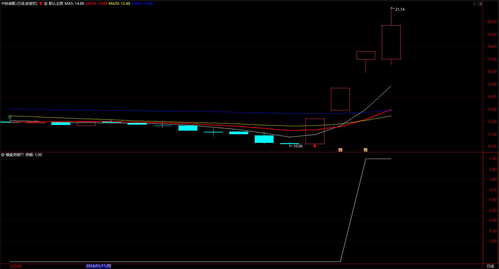 横盘突破,思路是 横盘窄幅整理,然后两组均线都上穿,带量能放大,有一定的涨幅。